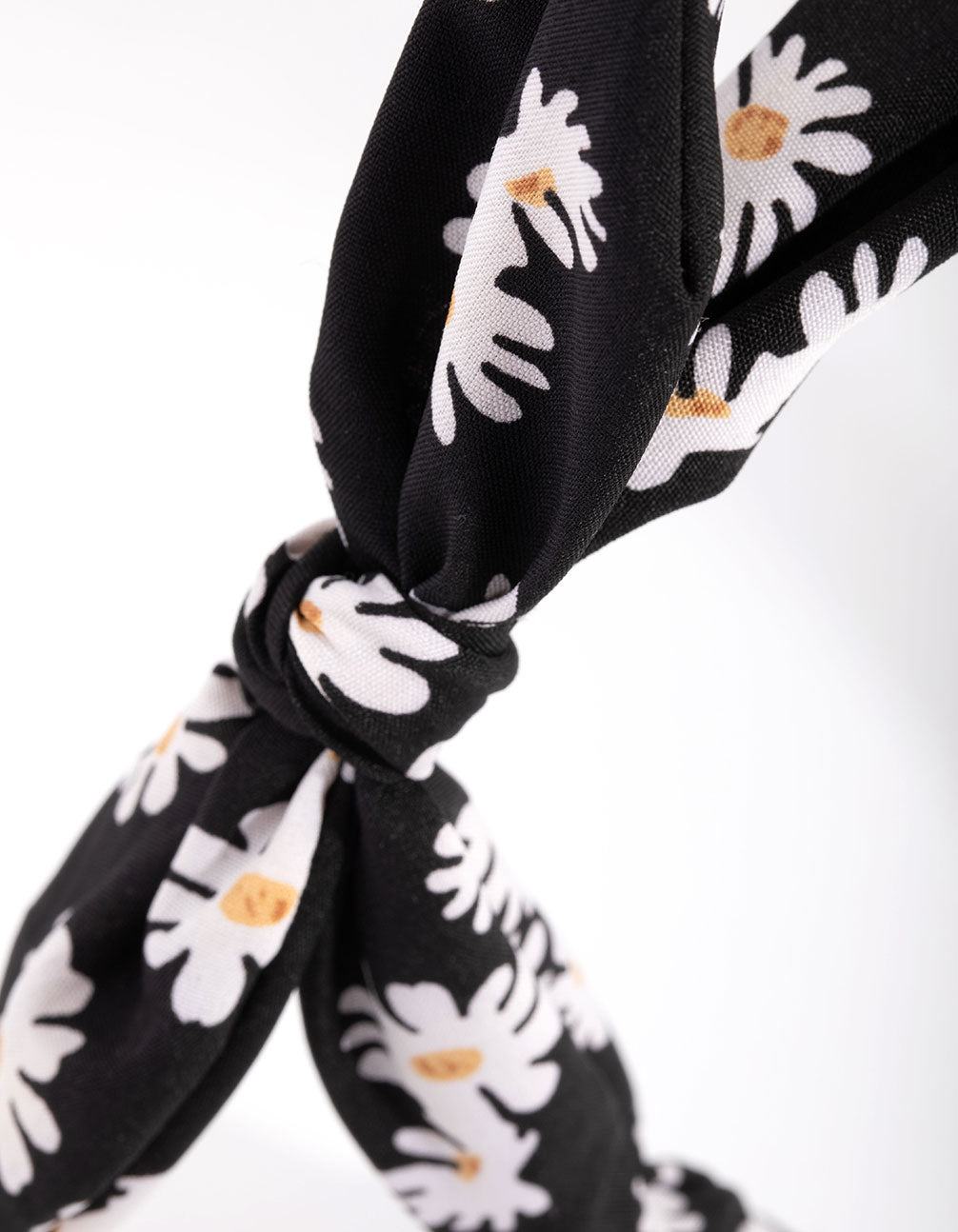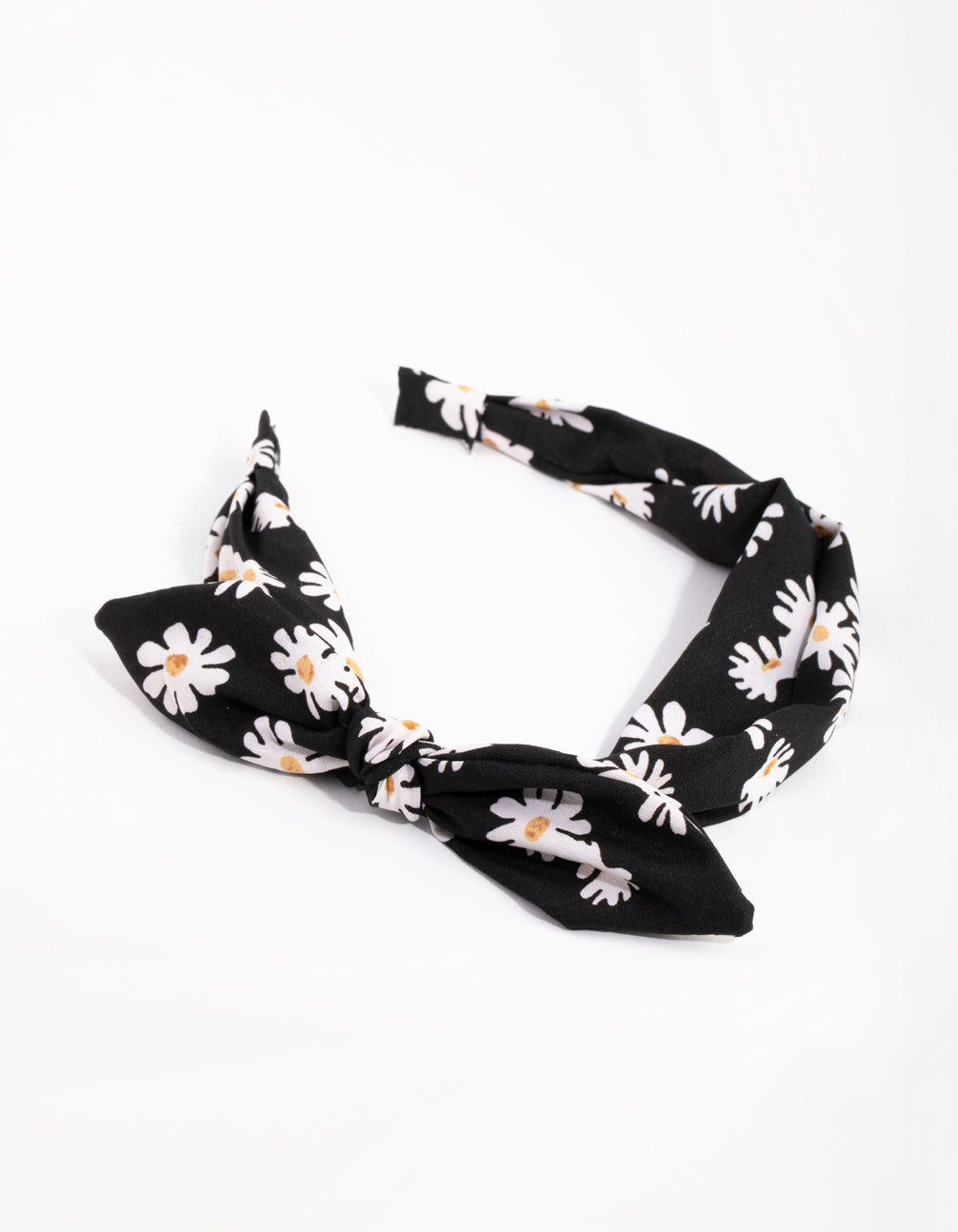 Headbands are back! This piece boasts a chic daisy print on black fabric, adorned with a pretty bow. Perfect for adding a finishing touch to your daytime ensemble.