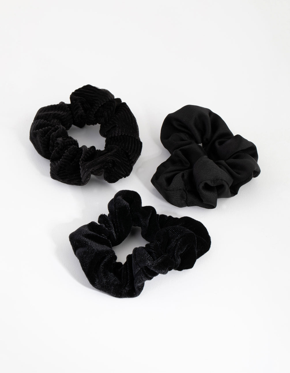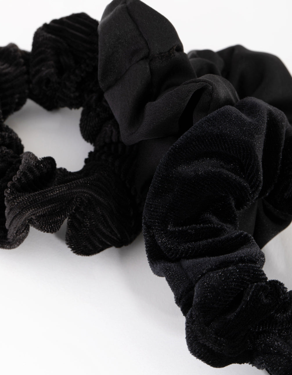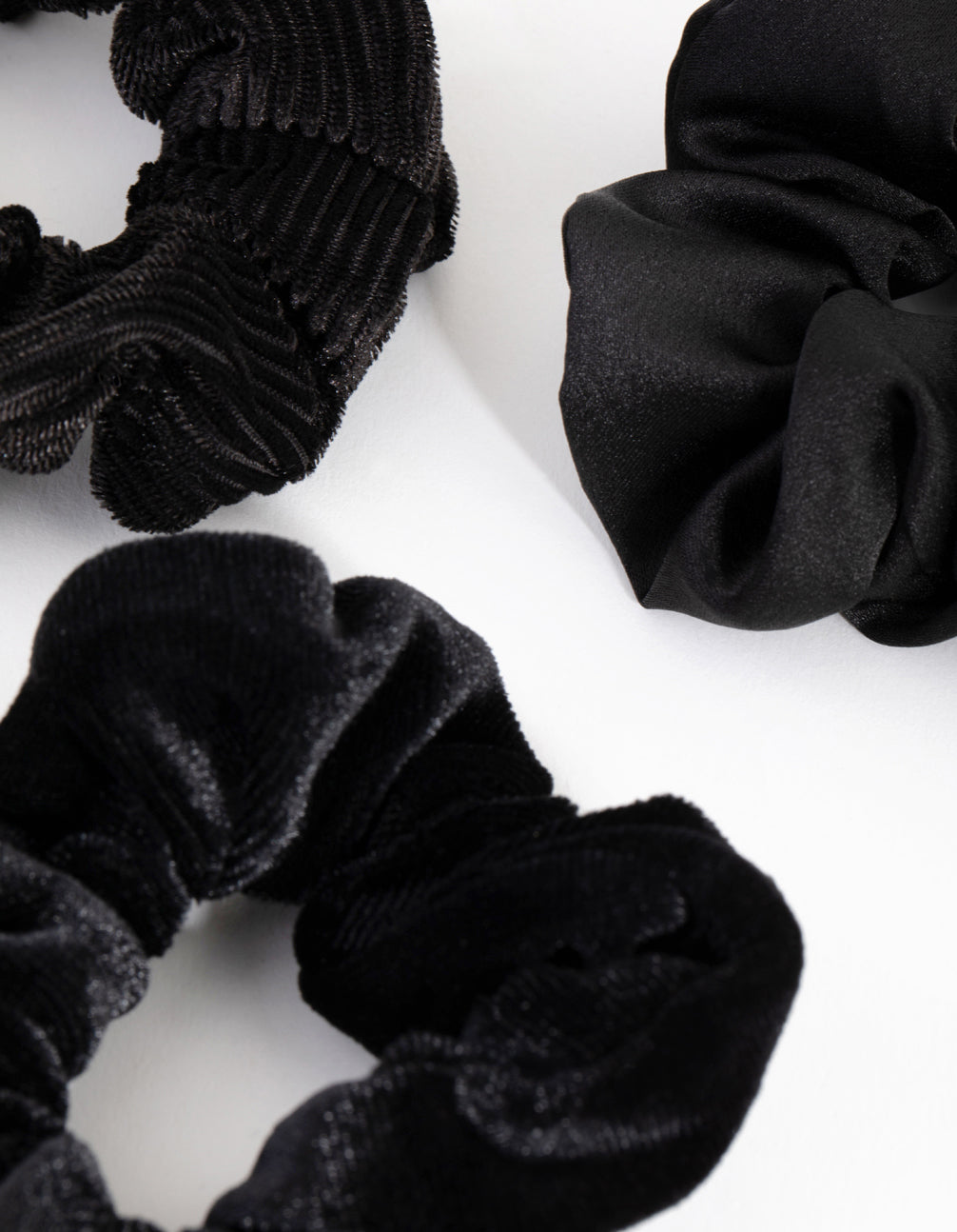 Embrace 90s trends with funky hair accessories! This pack includes three black scrunchies with both silky and velvet-like textures.