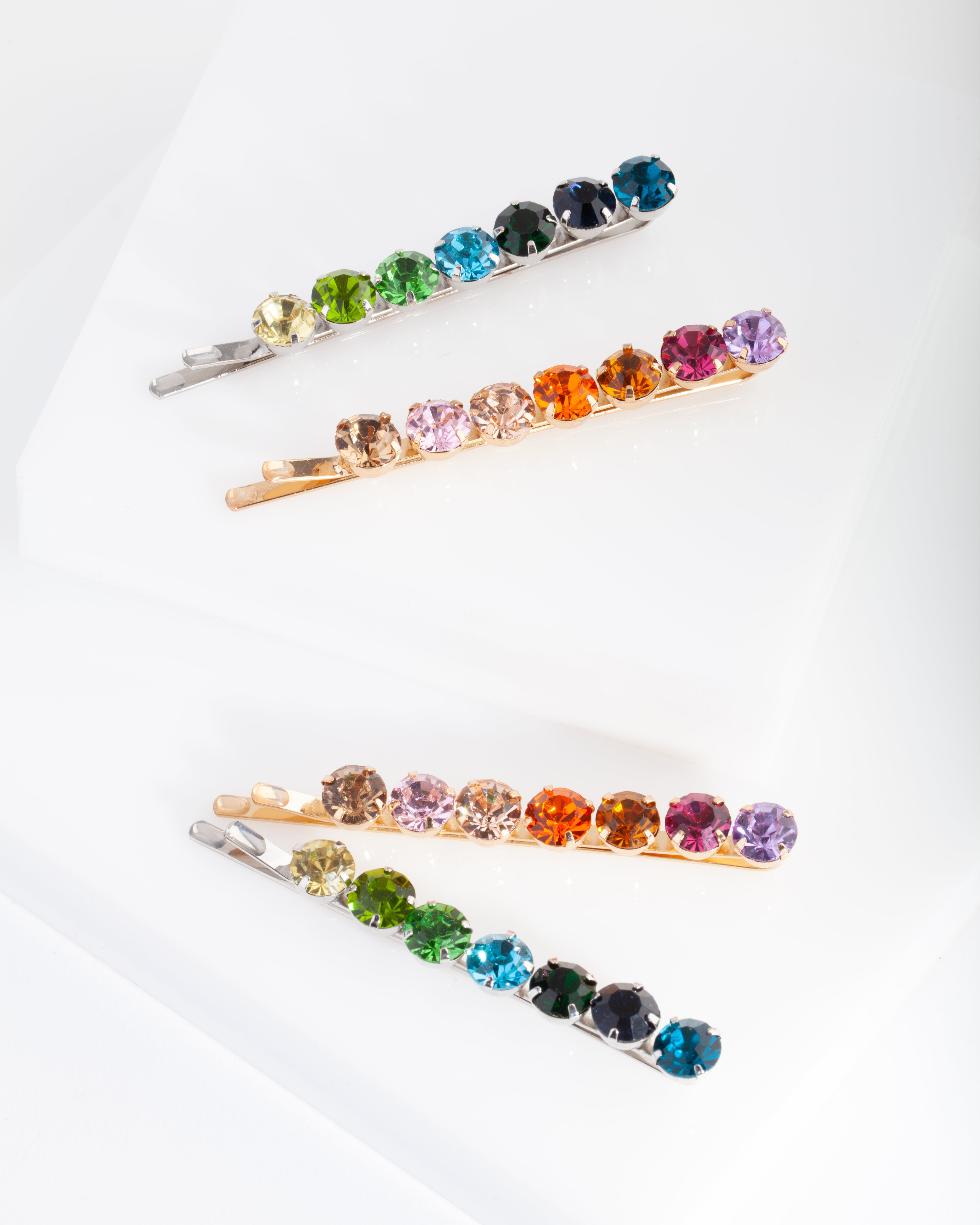 Shine as bright and colourful as a rainbow! This multi crystal hair pin set gold-toned and features fun rainbow coloured diamantes. Draw attention to your luscious locks with this hair clip pack.