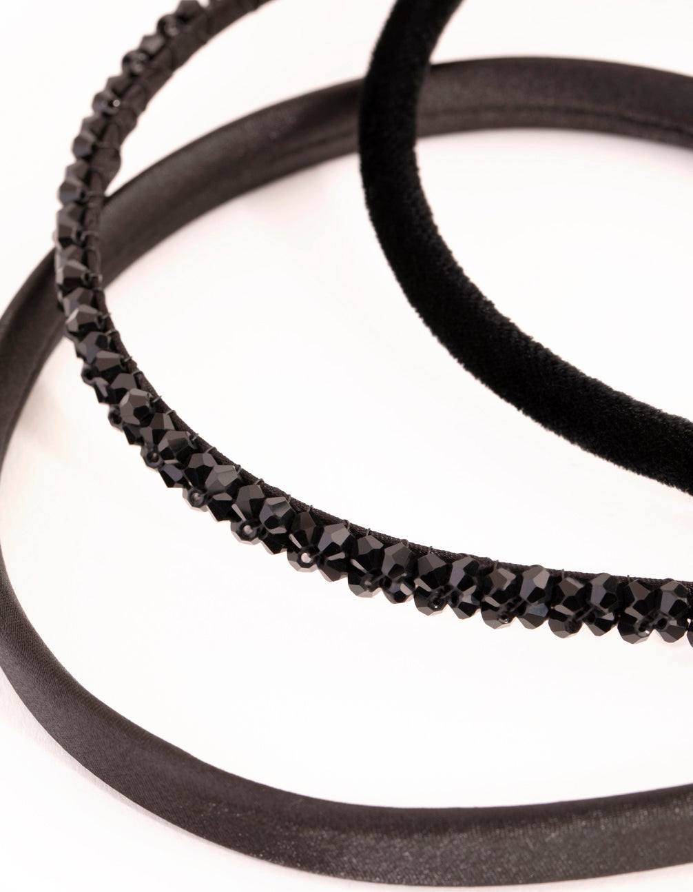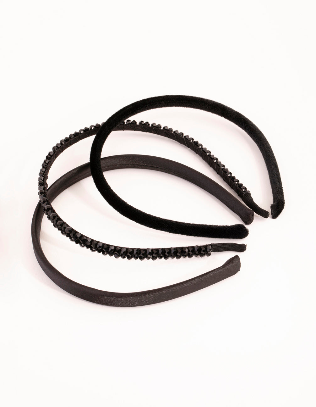 Accessorise with headbands! This set includes three simple, black designs that can elevate any ensemble. Each features a different band design, comprised of either velvet, satin or glossy black beads.