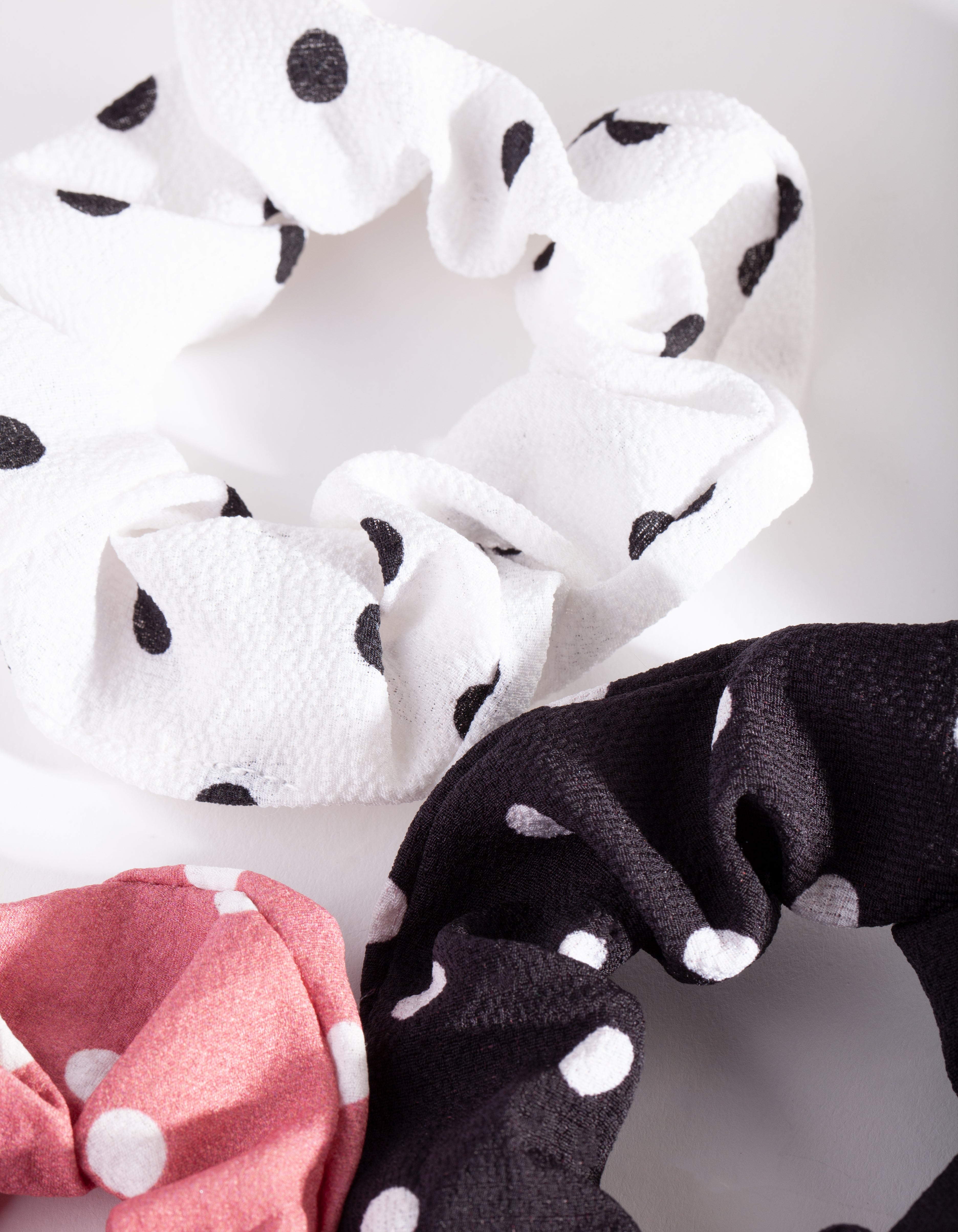 Scrunchies are back! Add some fun to your hair looks with a classic scrunchie! (Plus, they're great for the health of your hair!) This scrunchie variety pack comes in black, white and pink polka dots..