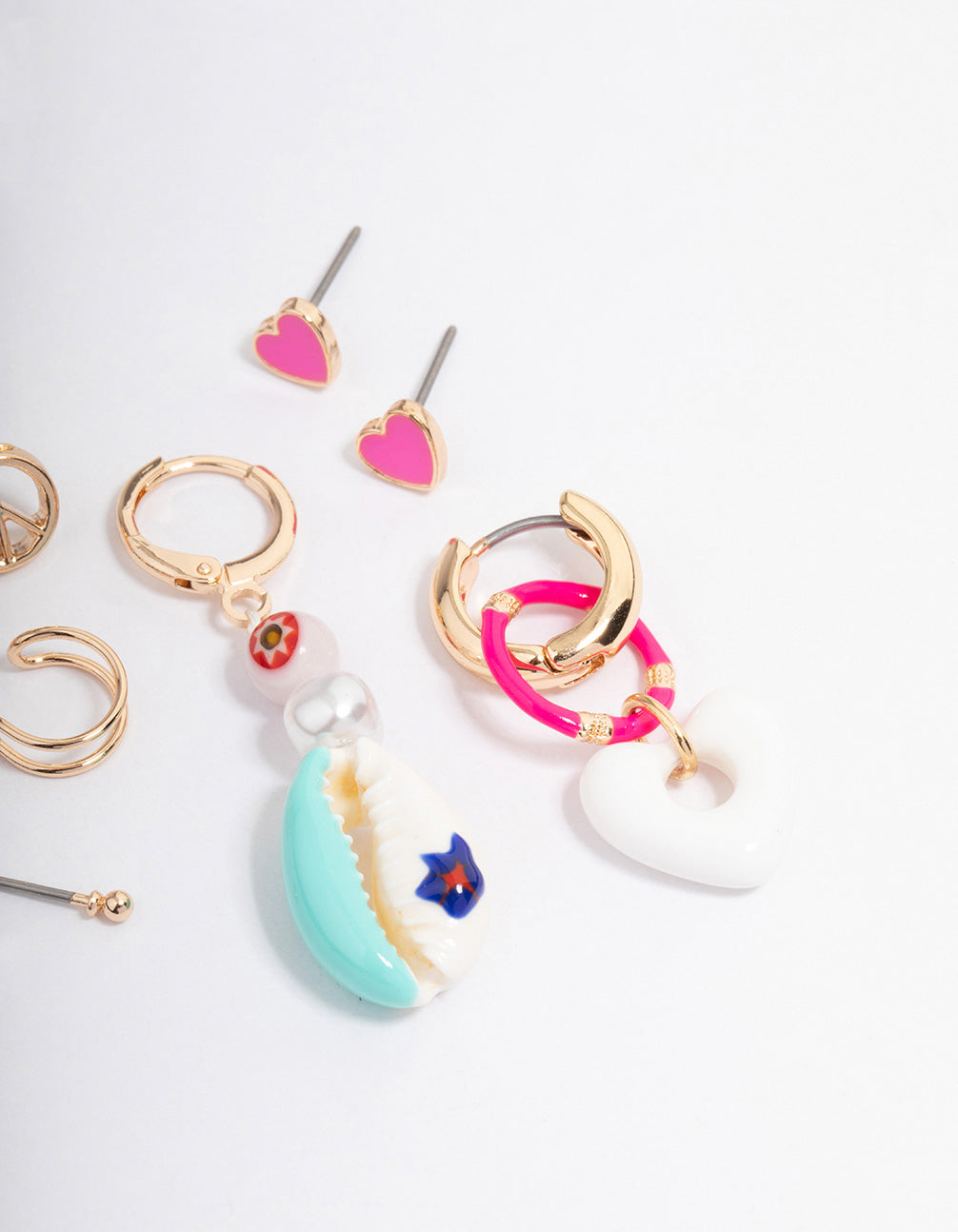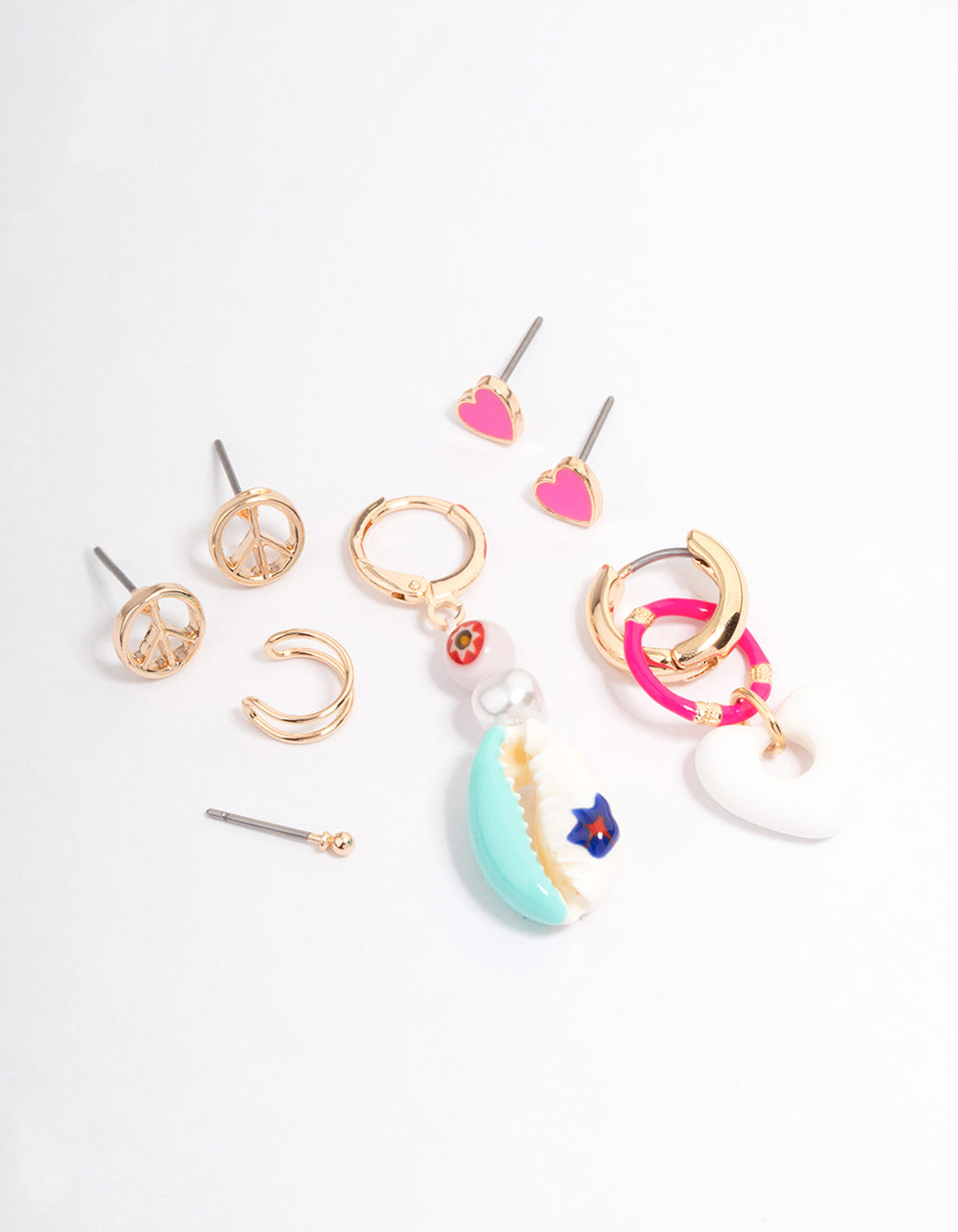 - This ear stack contains eight individual, gold-toned earrings - designed with peace sign and shell motifs for added interest.