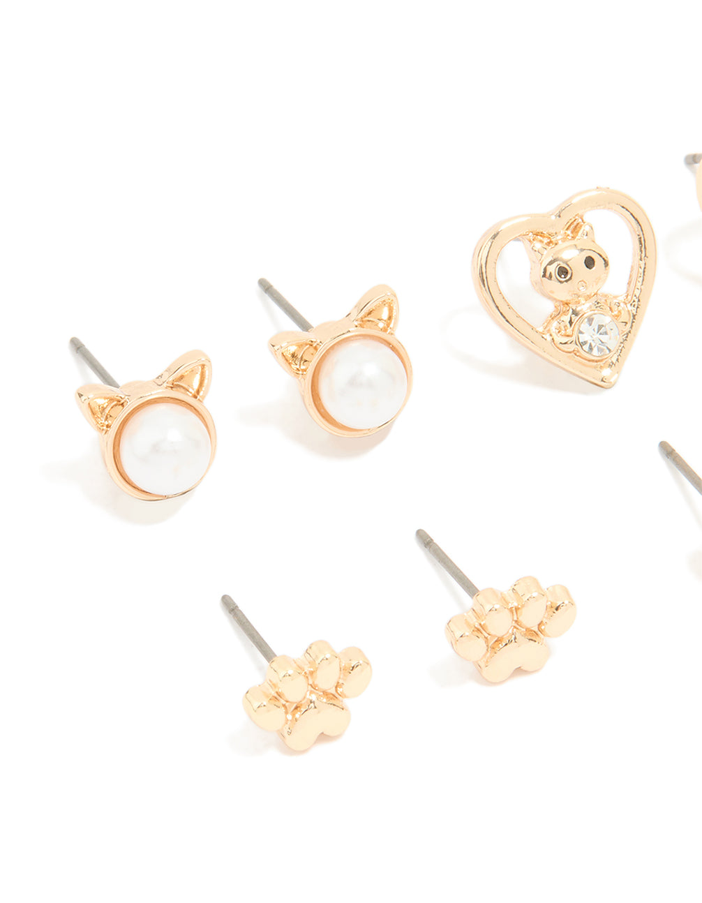 Kids Gold Cat Paw & Cat Design Stud Earrings 6-Pack