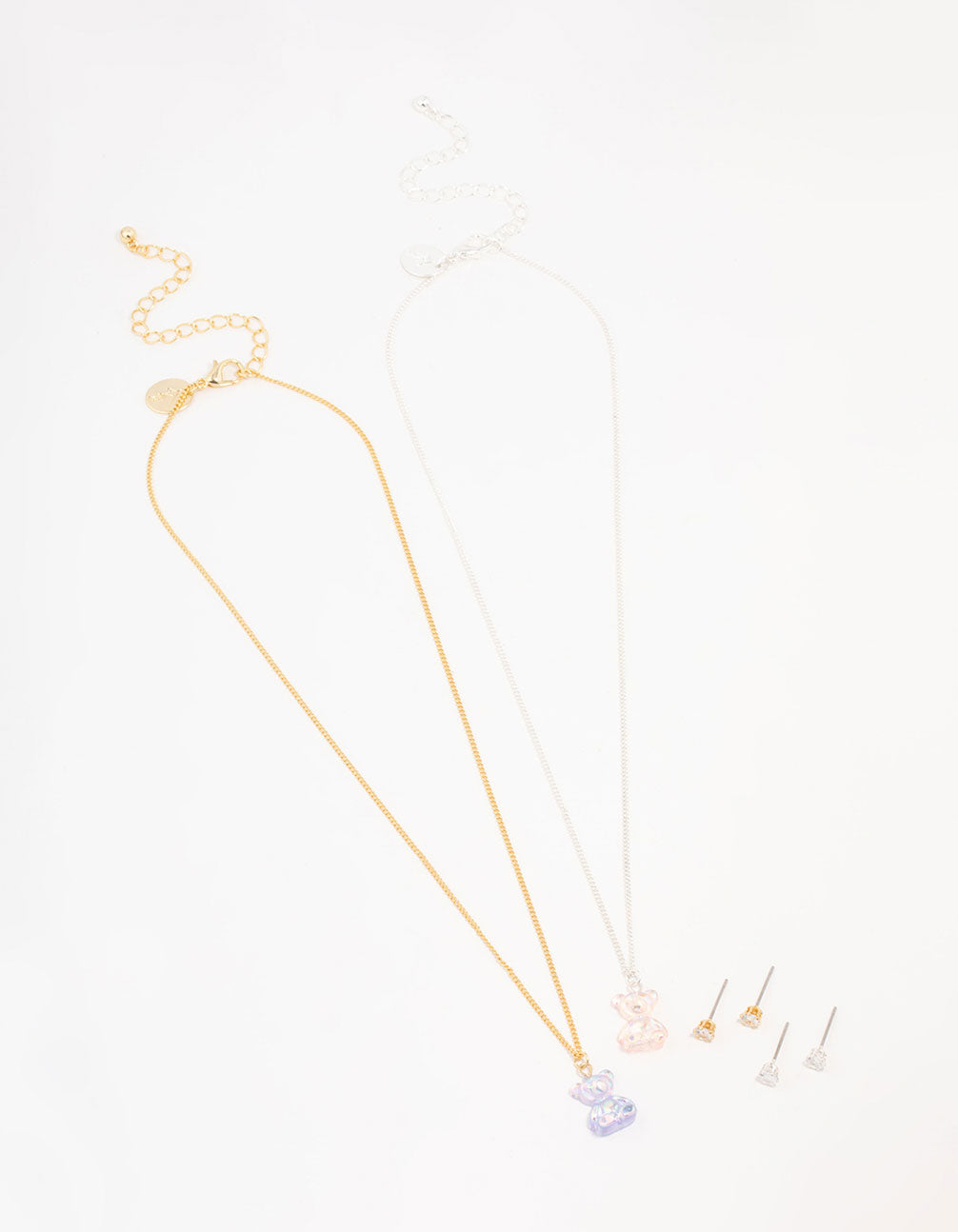 Treat your little one to this fun jewellery set that's sweet enough to eat. This colourful set includes two gummy bear necklaces and two pairs of diamante stud earrings, perfect for sharing with friends.