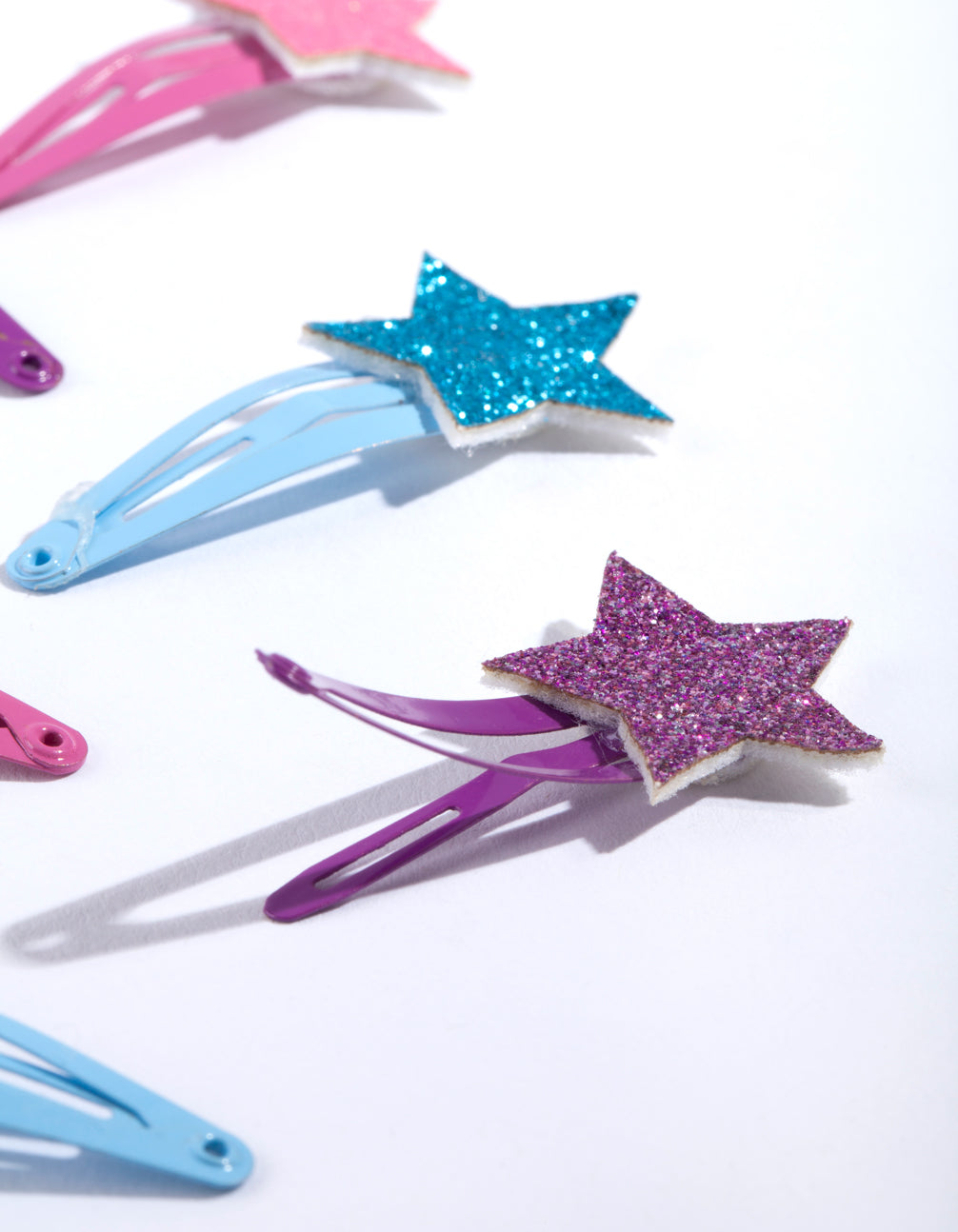 This range is perfect for young fashionistas. This glitter hair clip pack features a sparkly shooting star design in pink, purple & blue. This is the perfect kids accessory and/or gift.