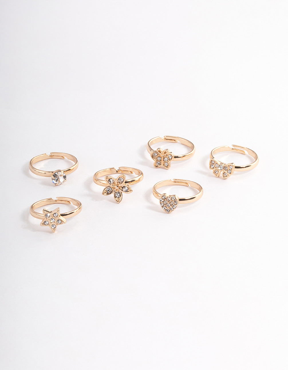 - This ring pack contains six individual stacking rings featuring diamante flower and bow motifs.