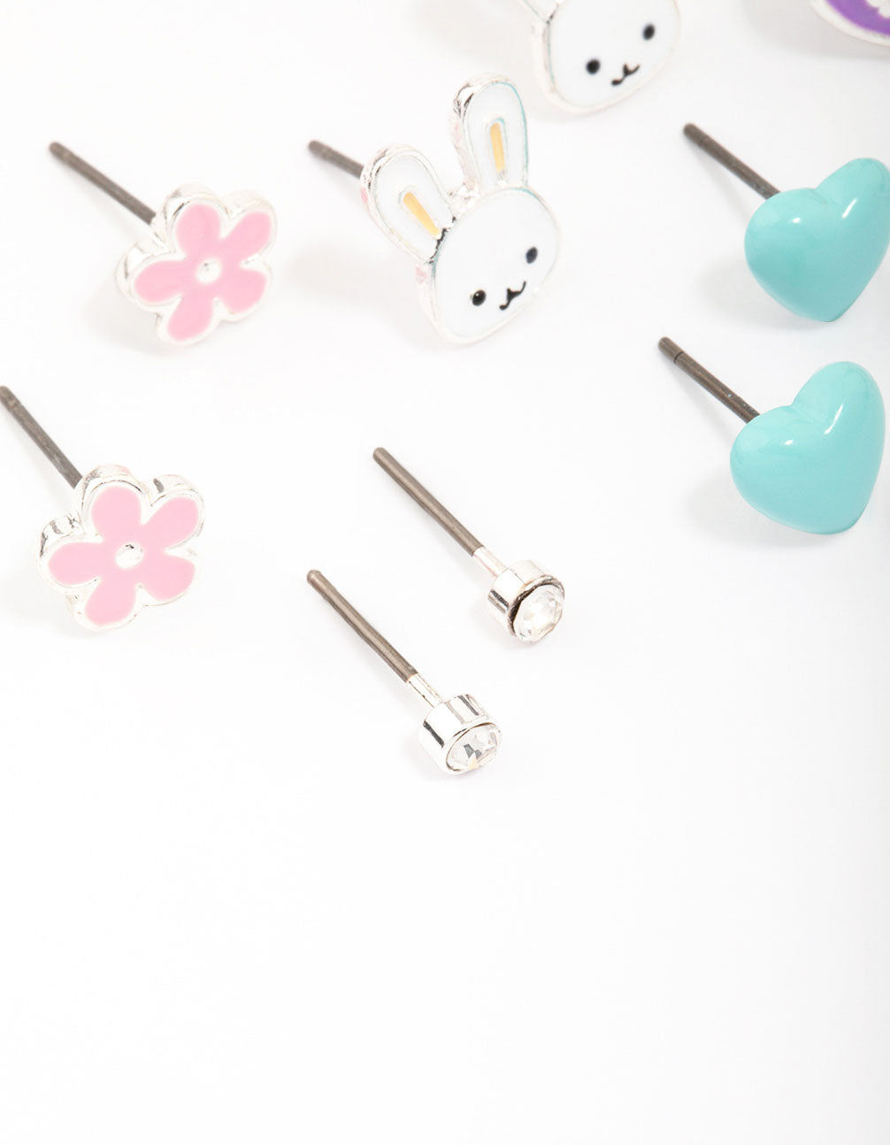 Kids Silver Easter Bunny & Heart Stud Earring 6-Pack