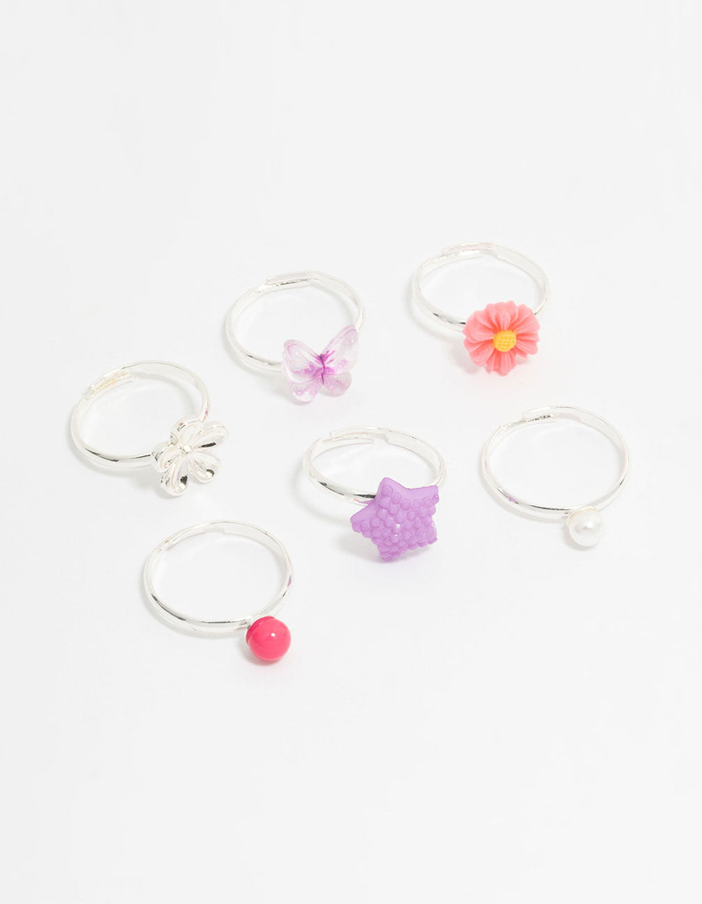 Kids Silver Pearl & Ombre Butterfly Fashion Rings 6-Pack