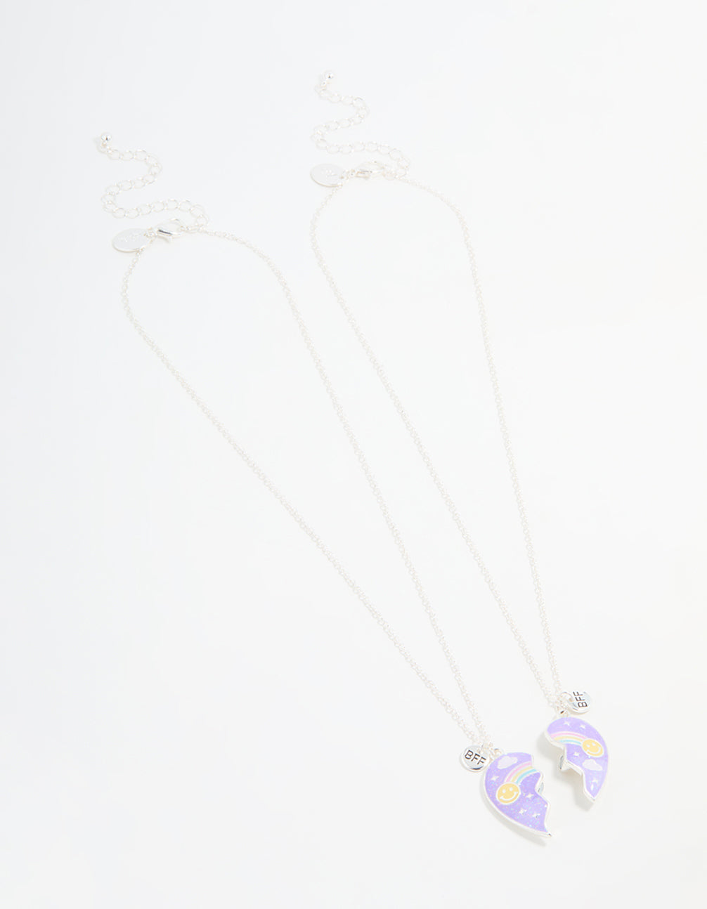 Celebrate friendship in style with this Kids Silver Rainbow Heart BFF Necklace Set! This set features two silver-toned pendant necklaces, each with half a rainbow heart design that fits together perfectly—just like you and your bestie.