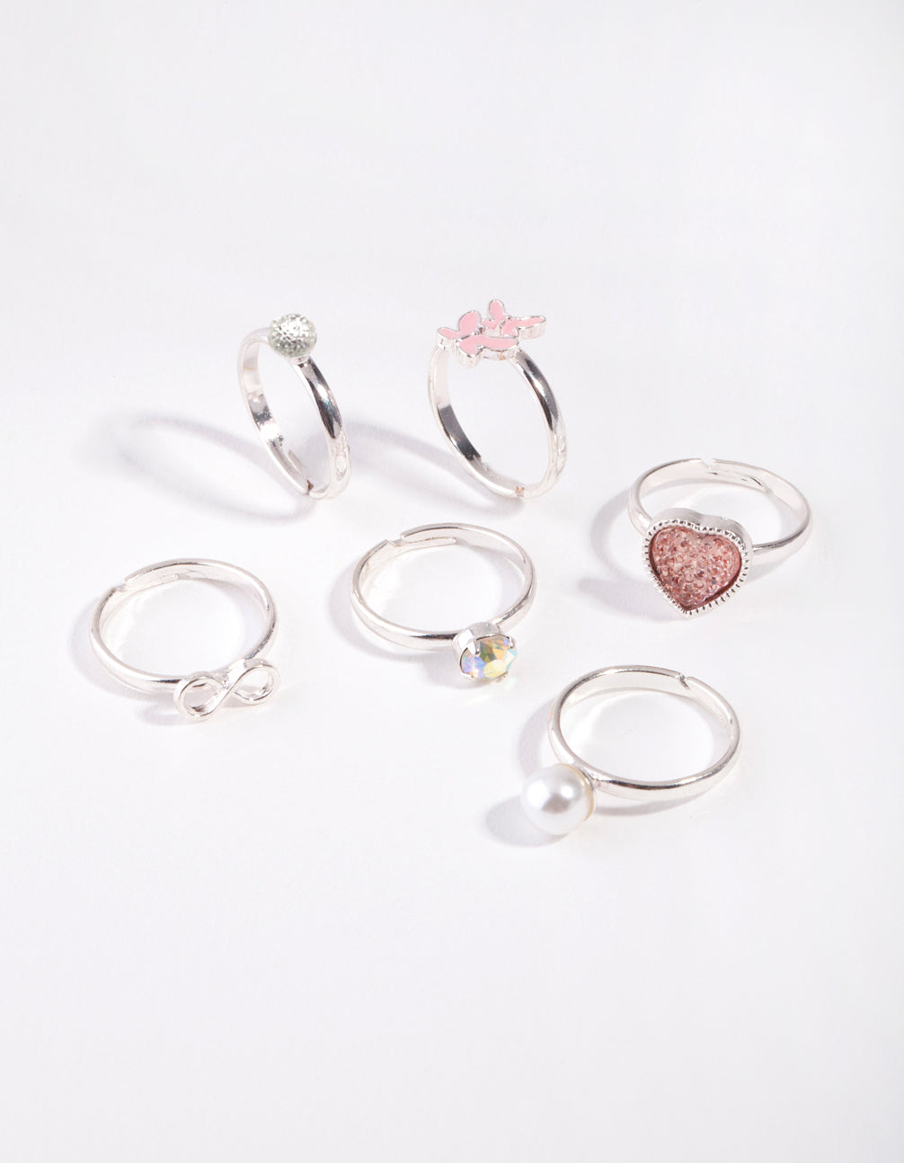 Lovisa KidÕs Collection is perfect for little ones with big imaginations! This lovely ring pack includes six pairs of rings, each with different designs that include pretty faux pearls, shimming diamantes and pink elements. Mix them, match them, stack them!