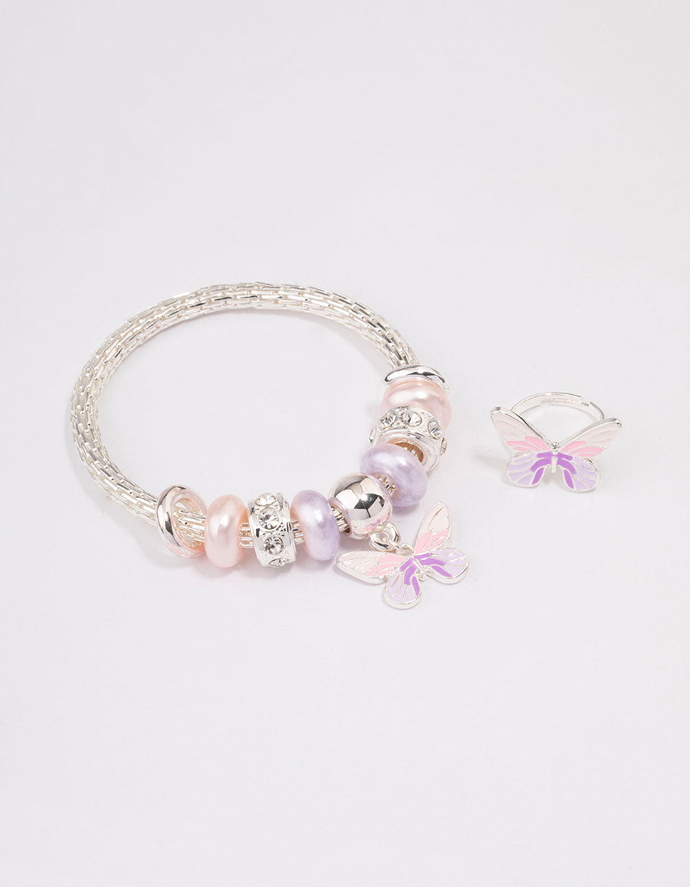Kids Silver Stretch Glitter Butterfly Bracelet & Ring Set