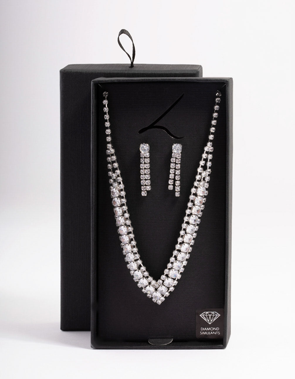- Style this diamond simulant jewellery set with a slicked back bun and black slip dress for a formal, going out look.