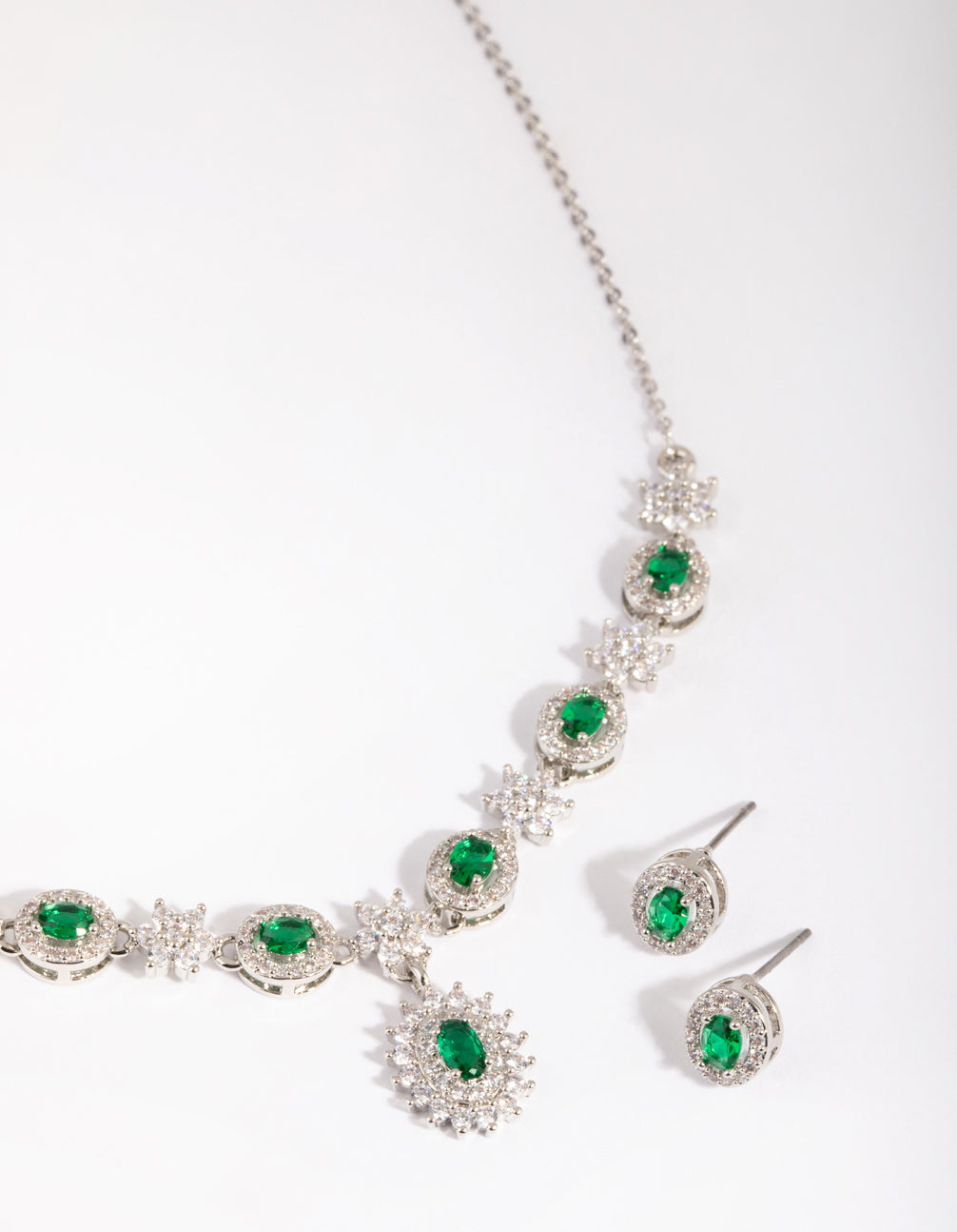 Silver Emerald Diamond Simulant Necklace & Earring Set