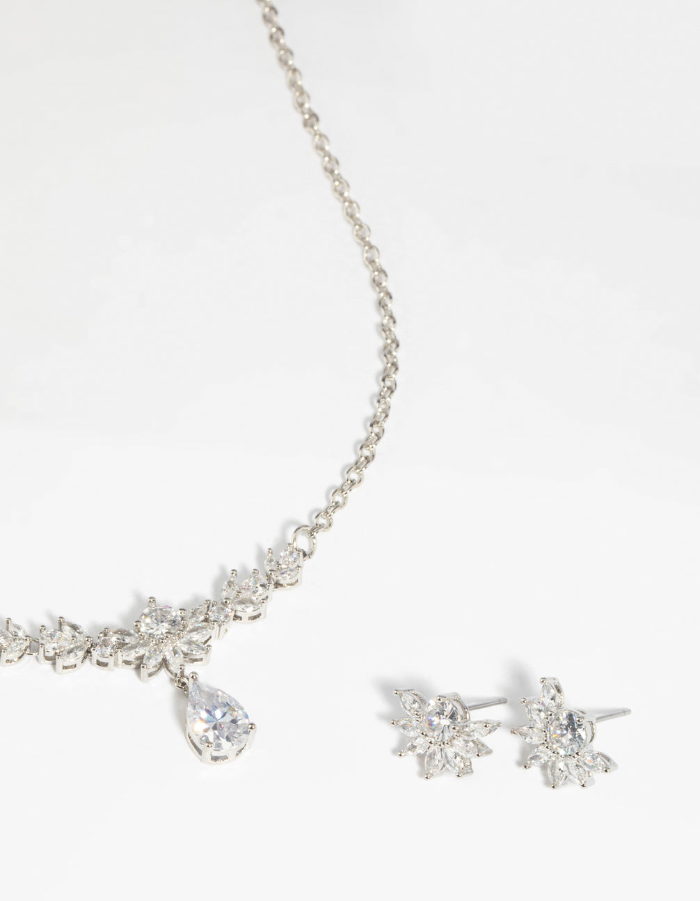 Dazzle with diamond simulants! This necklace and earrings set features diamond simulants, which are crystals that have been engineered to closely resemble the depth, colour and clarity of true diamonds. The design boasts classic 1920s styling. Elegant and timeless, dress it up or down!