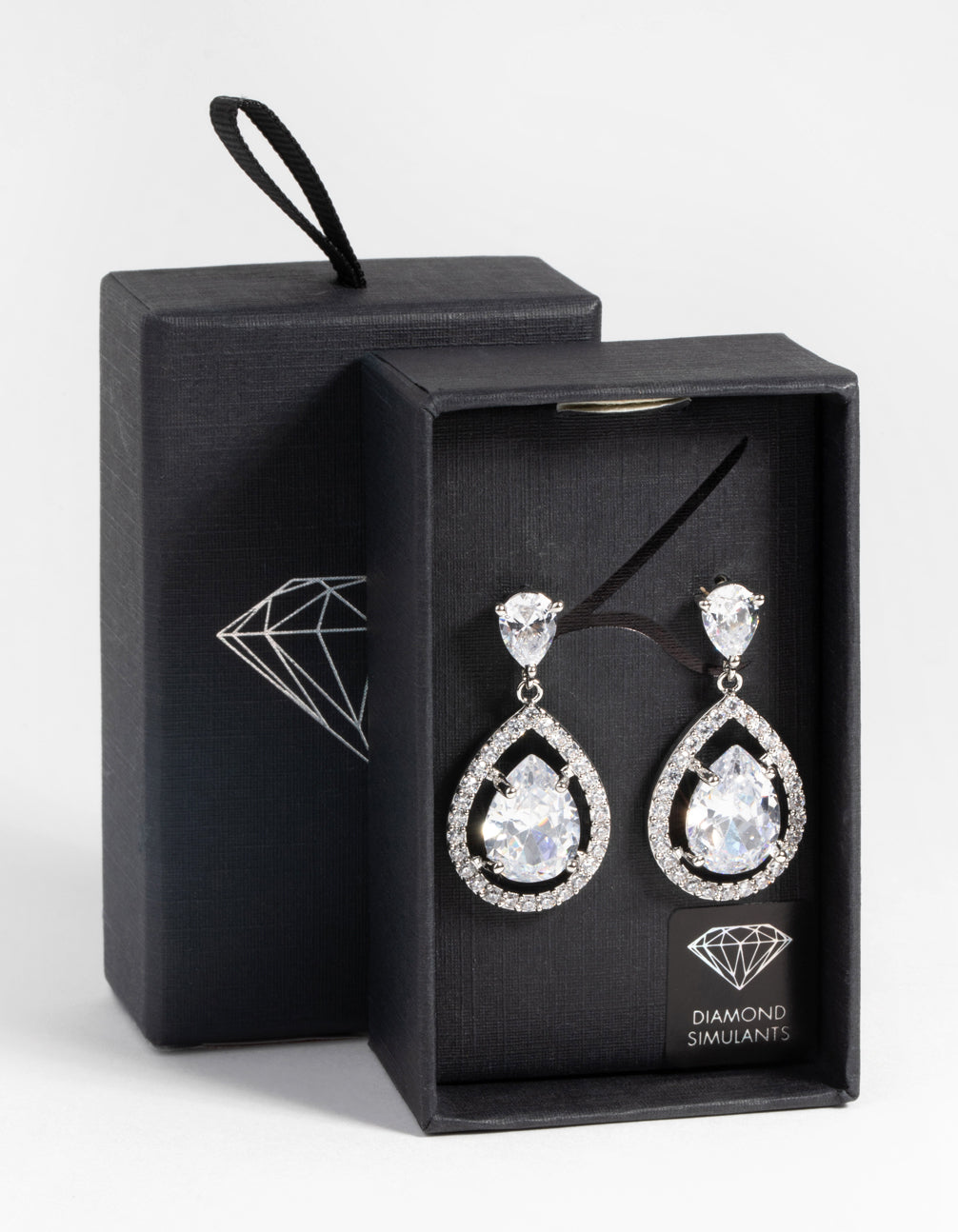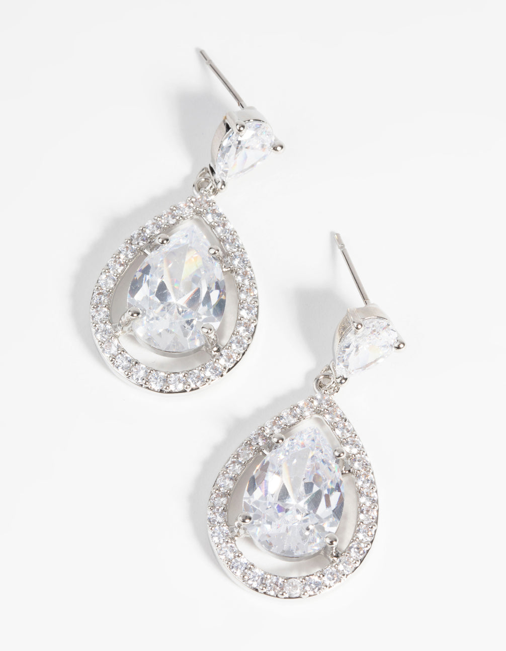 Rhodium Diamond Simulant Halo Teardrop Earrings