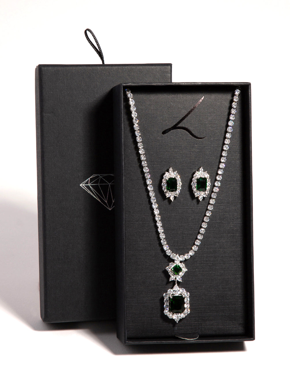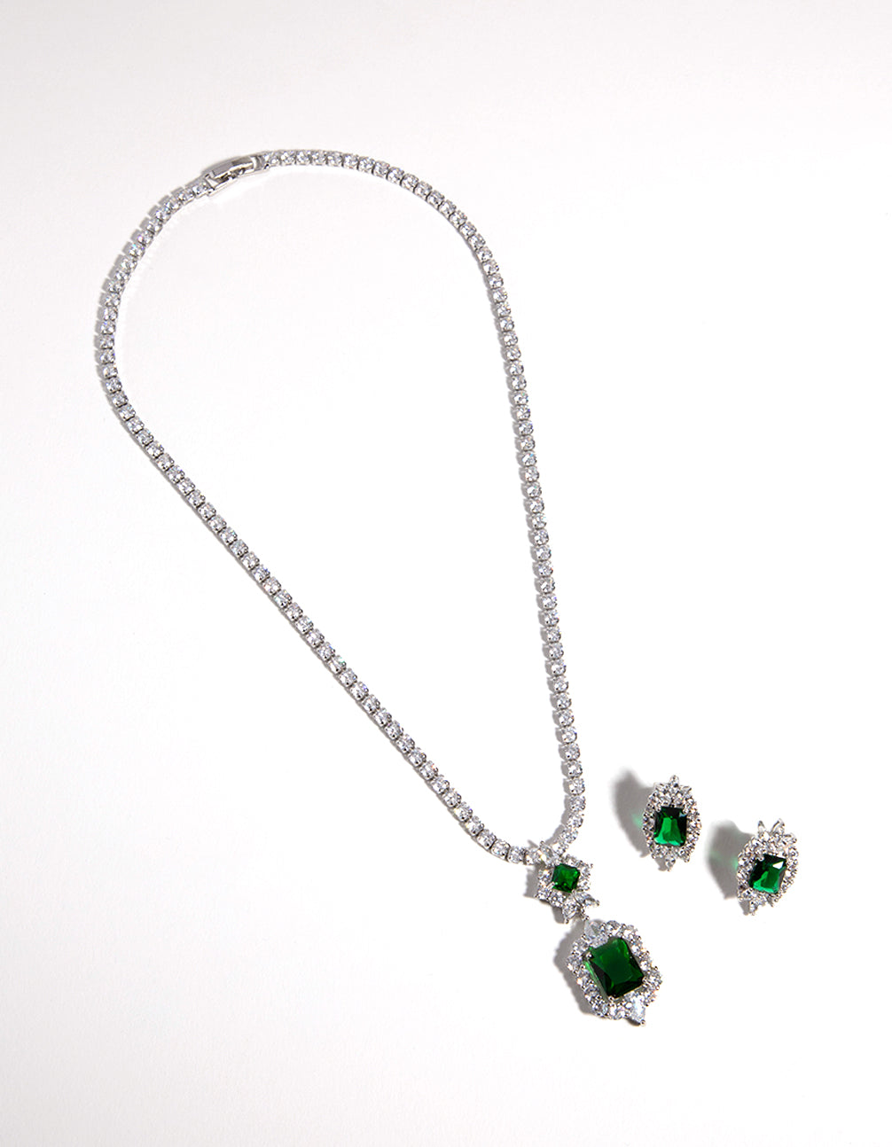 Sparkle everyday! These matching silver-toned emerald diamante necklace and earrings are the perfect set. Whether it's for yourself or a gift, this set is a glamorous one-step stylish finish to any outfit.