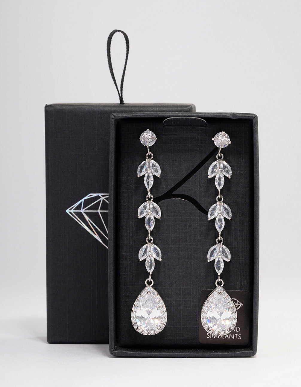 - These sophisticated drop earrings feature a shiny silver setting with pear-shaped cubic zirconia crystals in a leaf design for a glamorous look.