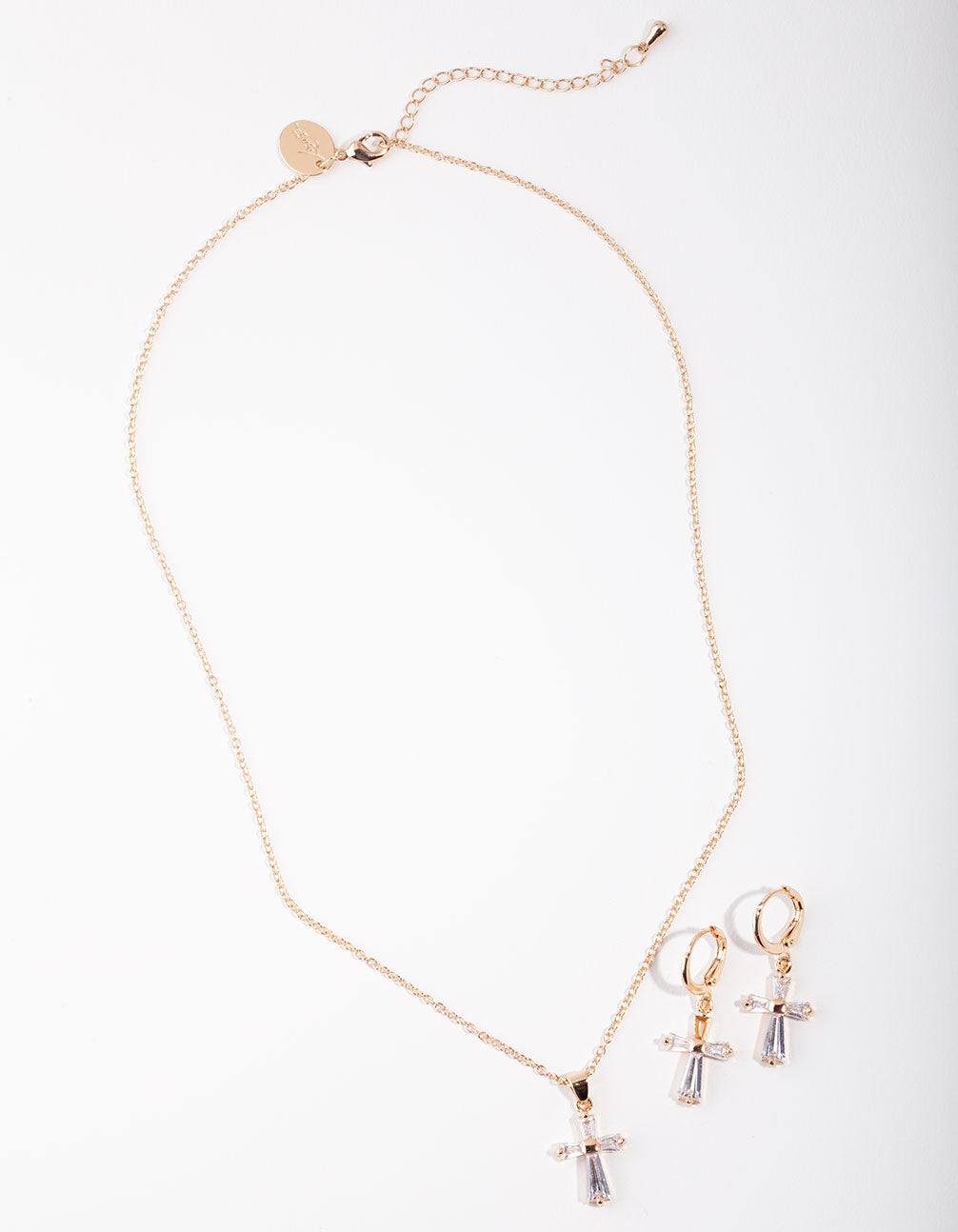 Sparkle everyday! These matching gold-toned diamante cross necklace and earrings are the perfect set. Whether it's for yourself or a gift, this set is a glamorous one-step stylish finish to any outfit.