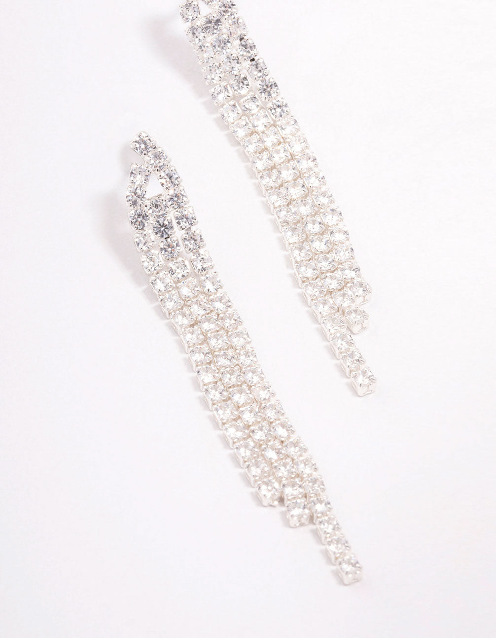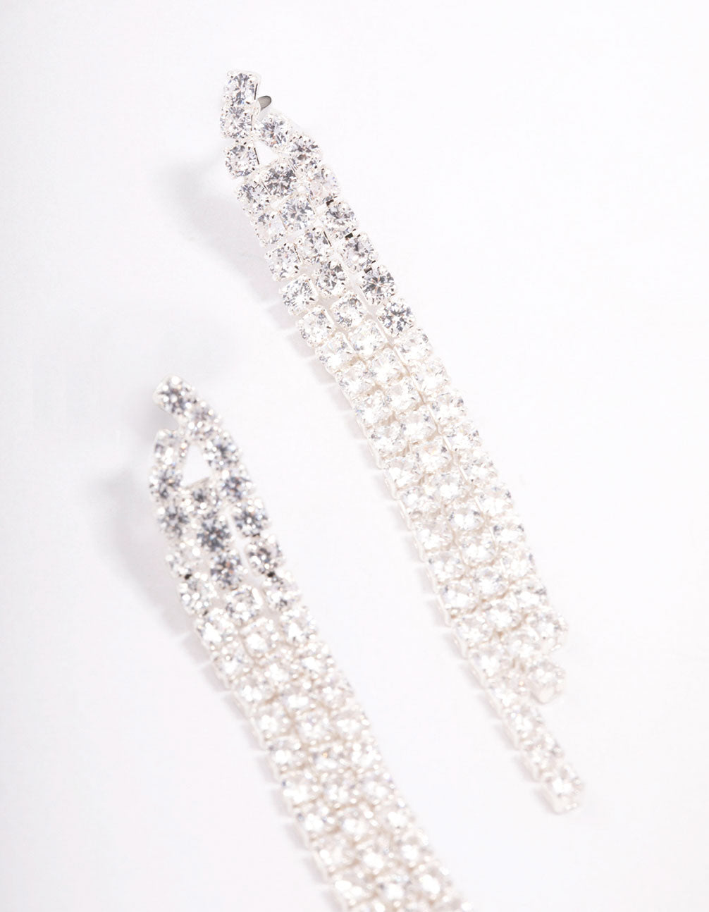 Style these Silver Plated Brass Triangular Cubic Zirconia Cup Chain Drop Earrings with a set of simple cubic zirconia stud earrings for a layered look.