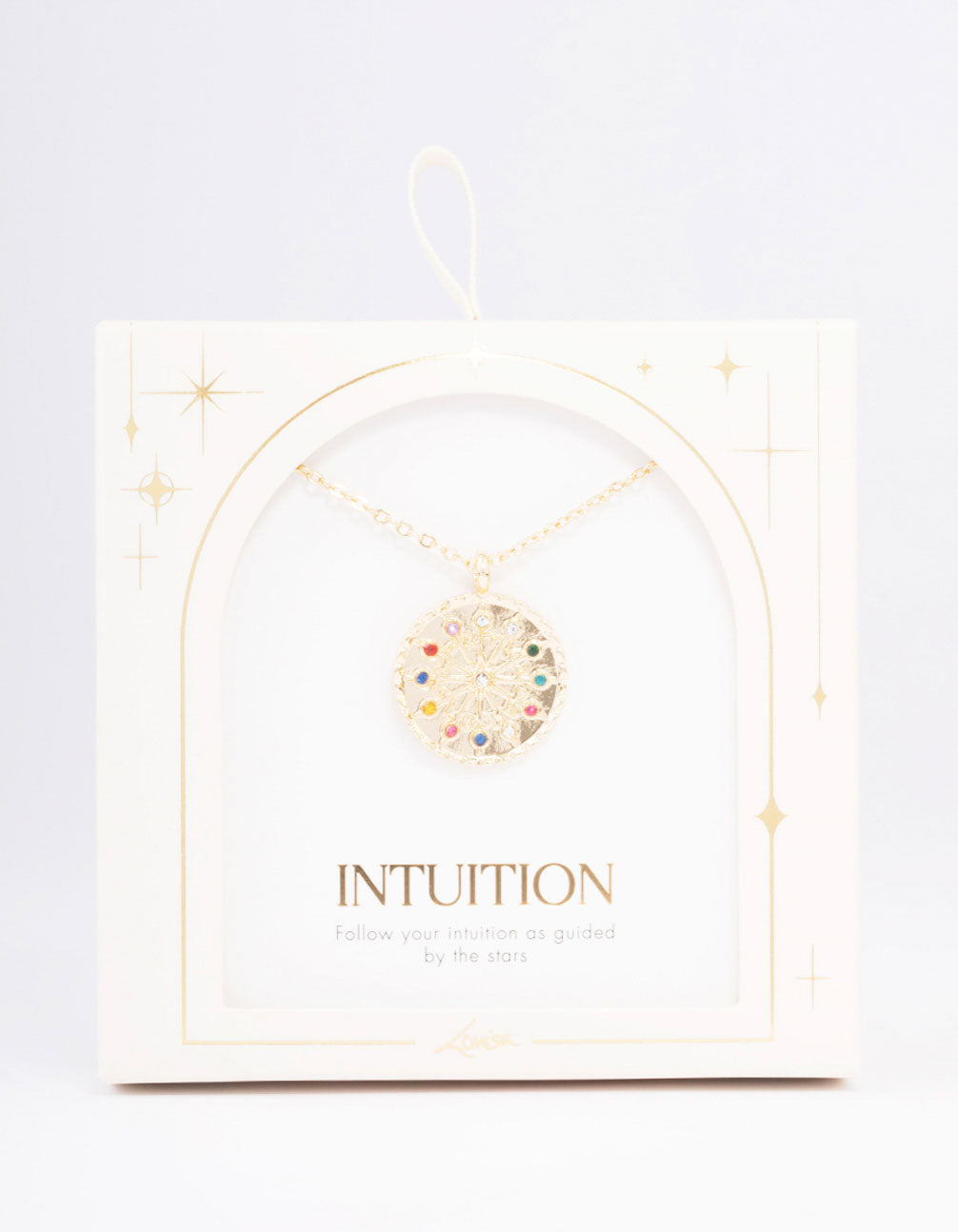 This gift set features a gold plated pendant necklace adorned with an astrology-inspired pendant.