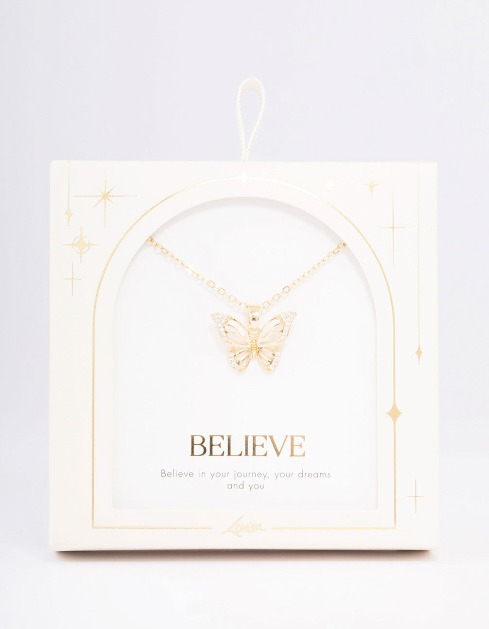 - This gift set features a gold plated pendant necklace adorned with a cubic zirconia encrusted butterfly pendant for a hint of glamour.