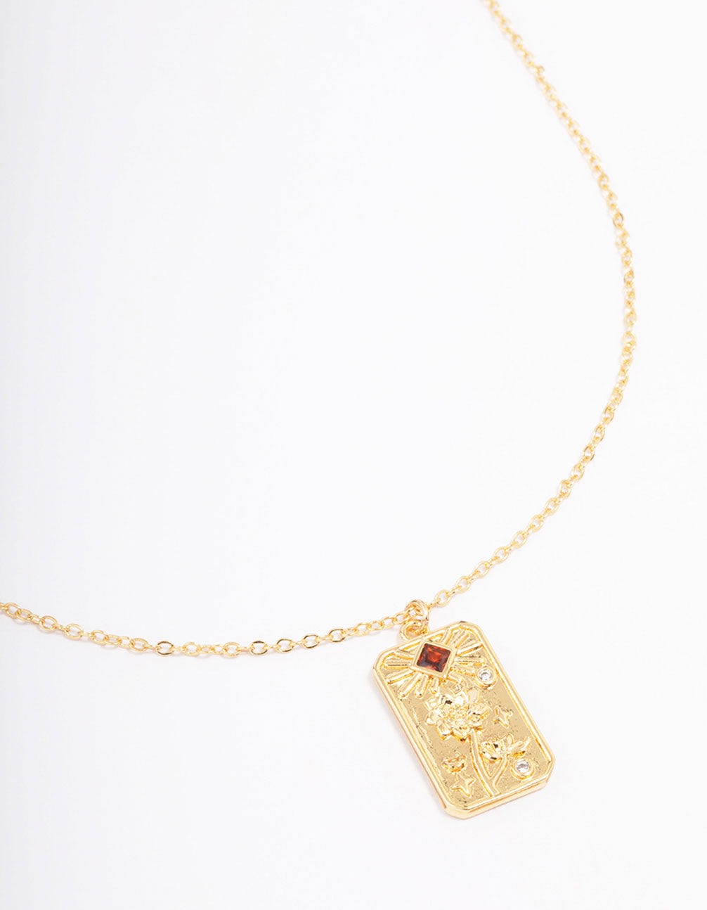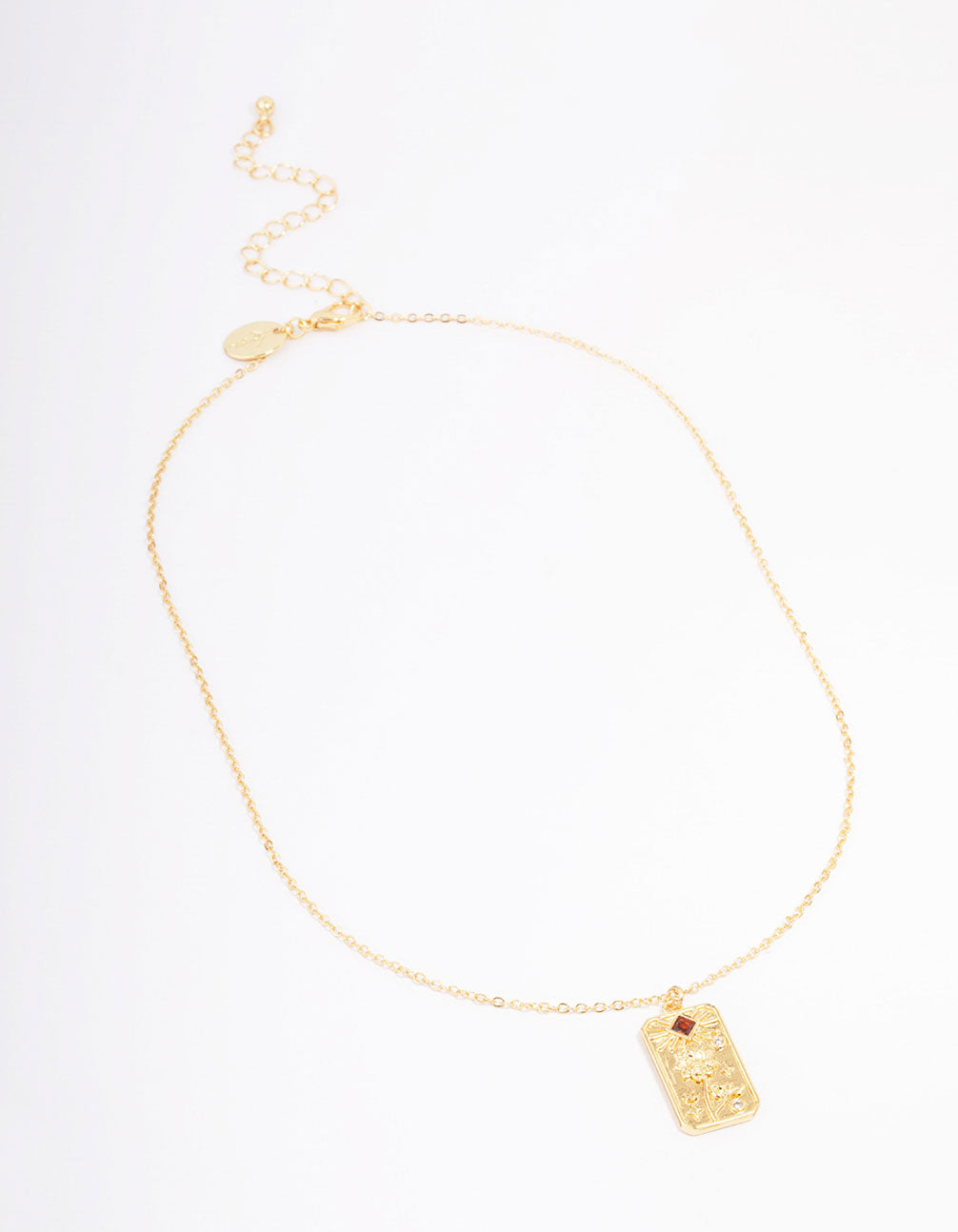 This gift box contains a gold plated pendant necklace featuring a Larkspur floral design and ruby cubic zirconia crystal, representative of the July birth month.