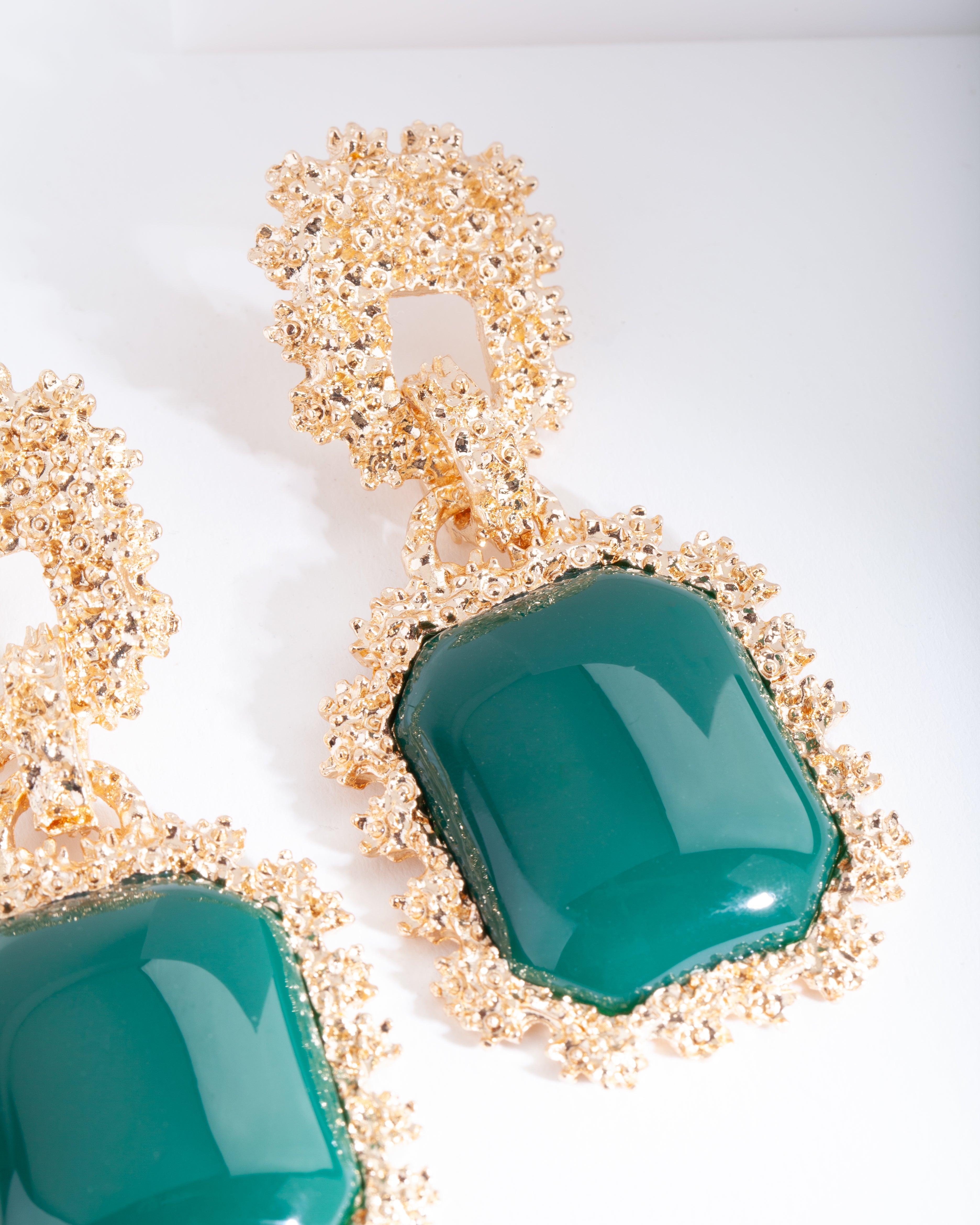 A fun pair of fashion earrings are an easy way to spice up your daily ensembles! These earrings come on a textured gold-toned setting with a green stone embellishment. Hypoallergenic.