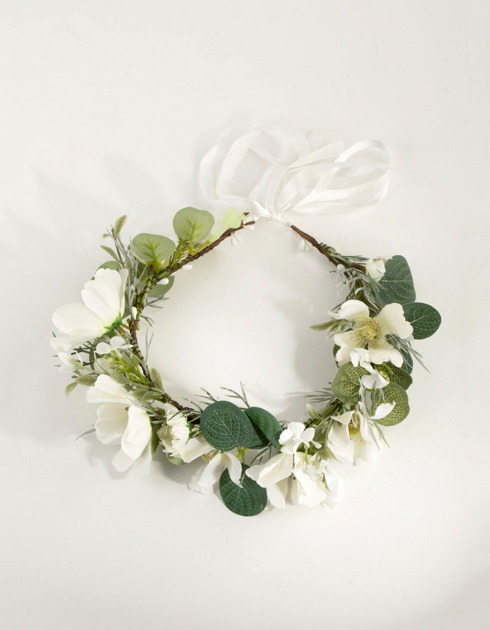 For formal hair pieces with natural undertones look to our floral crowns. This beautiful halo wreth features a white floral design with fabric flowers, faux leafs and vines woven around a wooden-style band. A white ribbon attachment serves to secure this piece and allows for some adjustment. Wear this piece for a formal look with an organic edge.