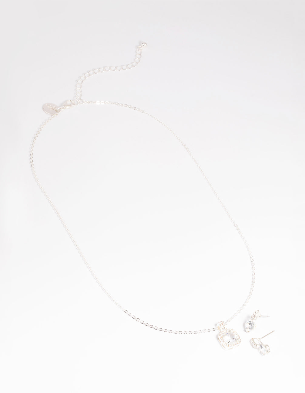 Silver Diamante Cushion Cut Necklace & Earrings Set