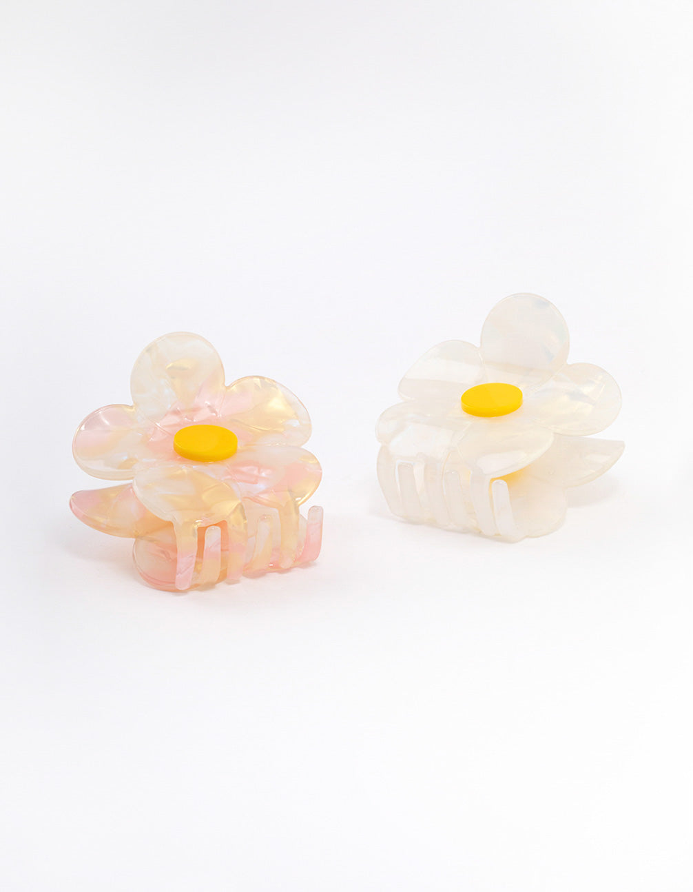 - This hair clip pack includes two acrylic floral claw. Style them with a pair of floral huggie earrings for a cohesive look.