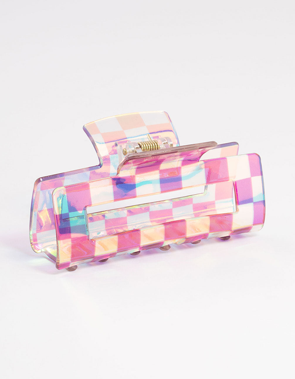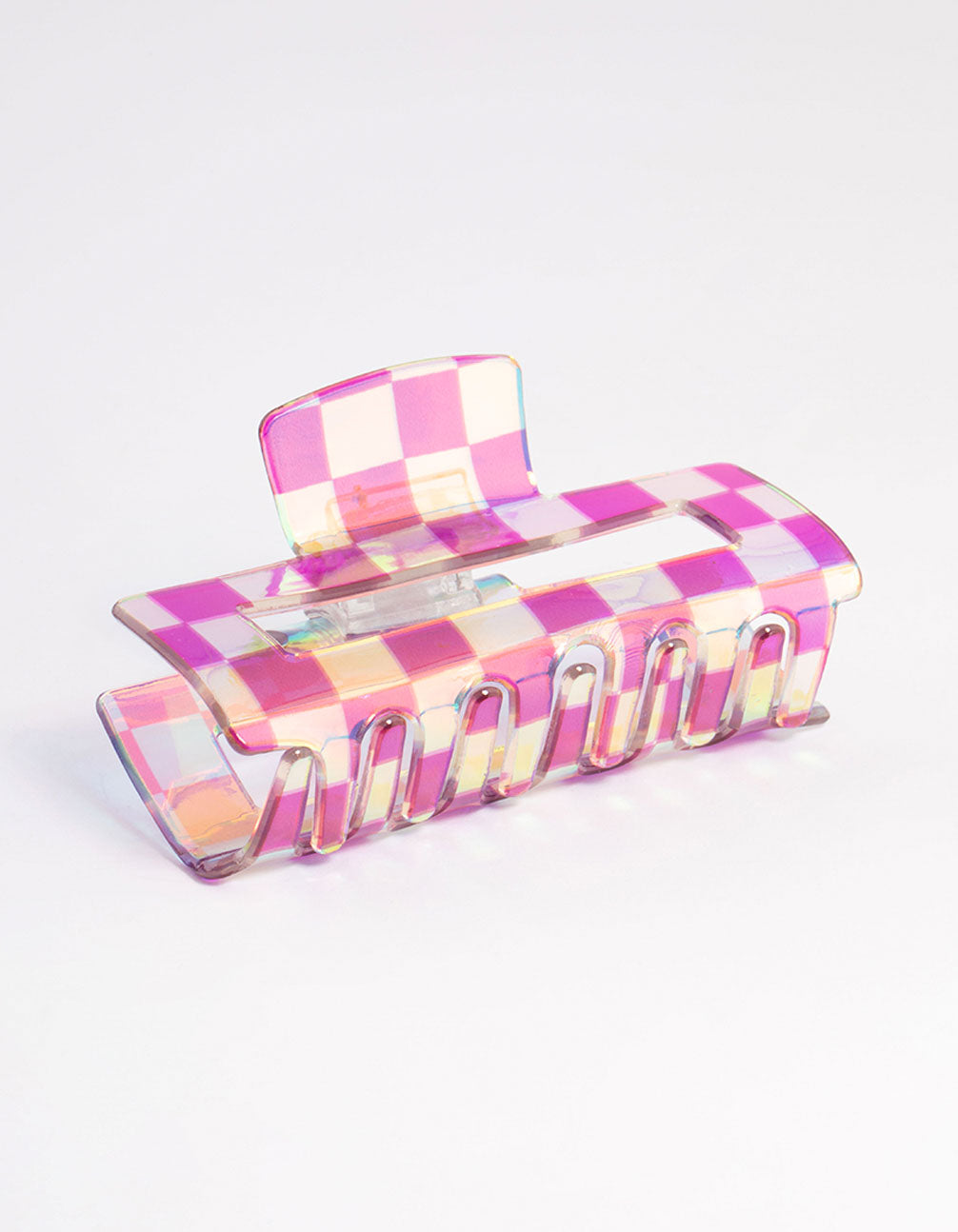 - This claw clip features a geometric, checkered design. Pair this clip with matching accessories from our Purple Collection for a cohesive look.