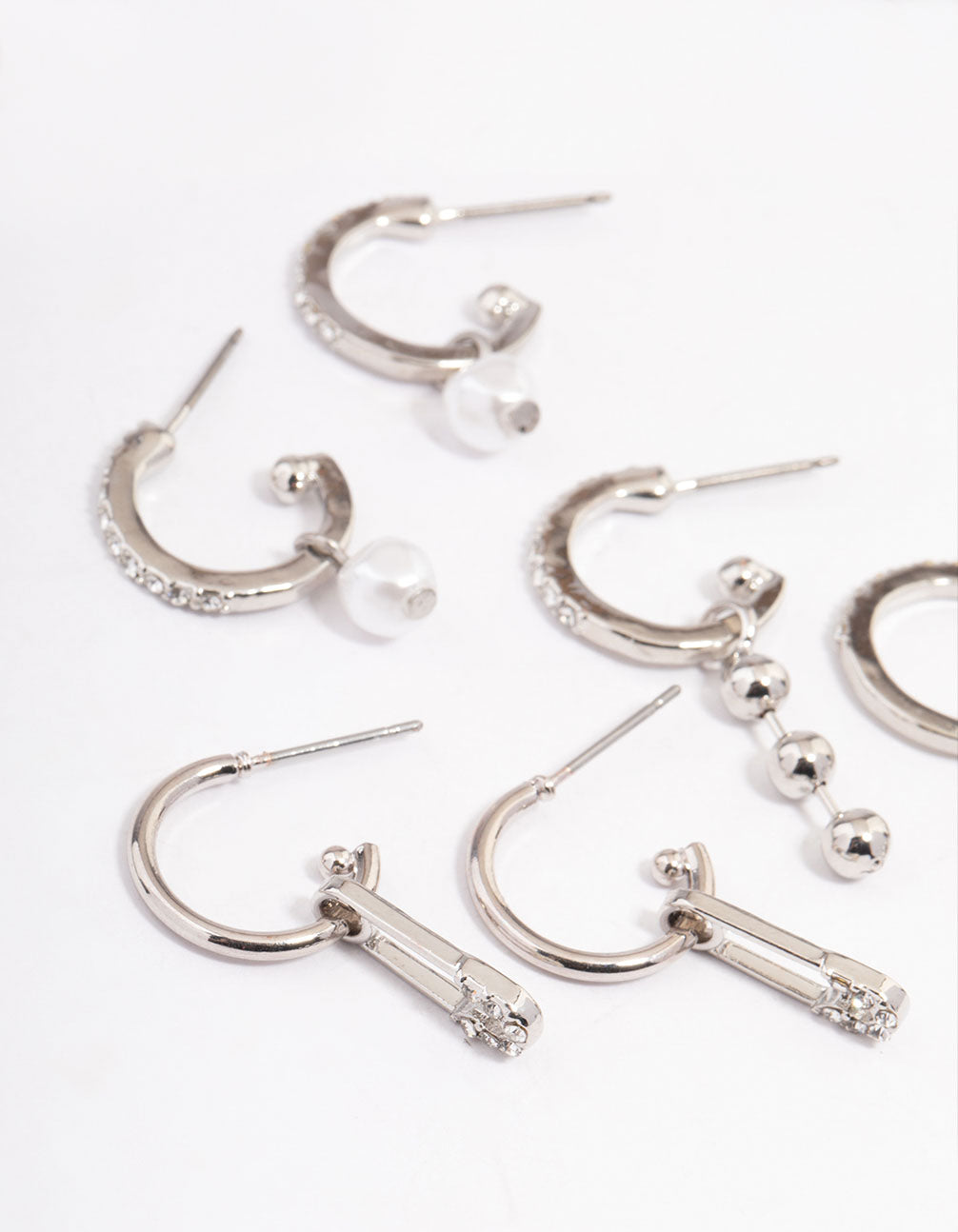 - Style these silver-toned, safety pin motif stacker earrings with an adorning ring stack for a layered look.