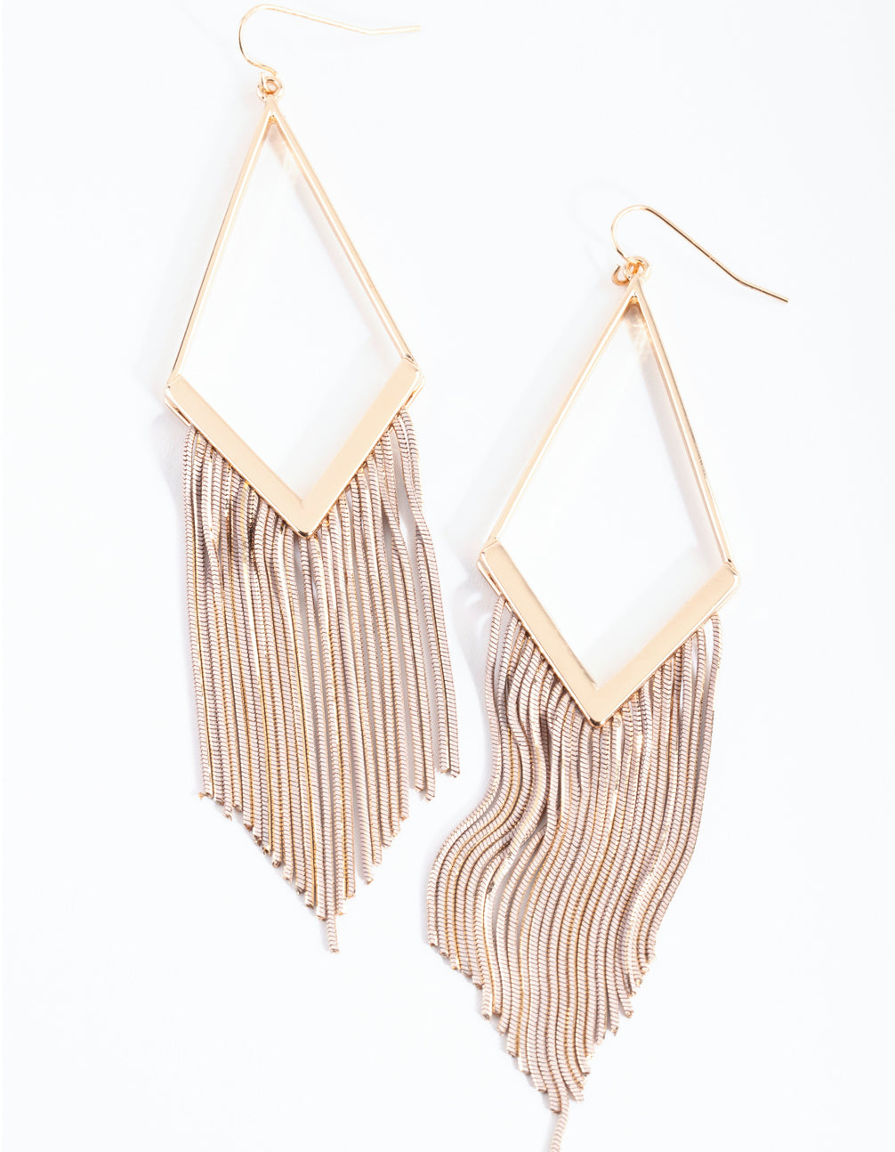 Rose gold toned pieces add a touch of feminine luxury to your looks. The pinkish hue has become one of the most fashionable metals. These earrings boast a rose-gold-toned setting with a triangle design and textured chain tassels. Style with dainty rose gold-toned rings and a delicate necklace for a chic look.