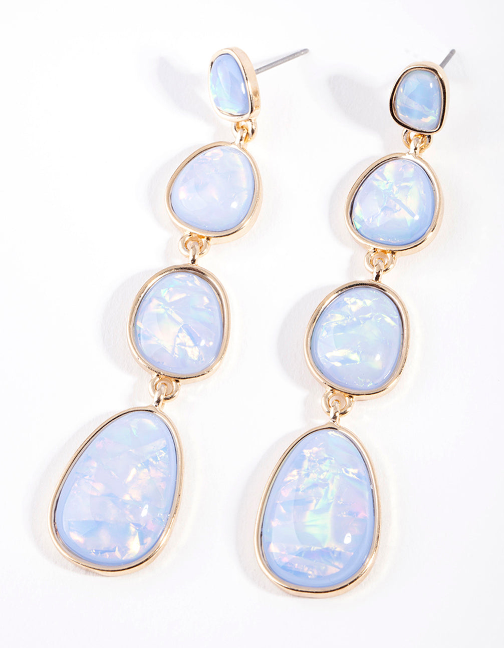 These gold-toned drop earrings with light blue foil stones are the perfect pair of statement earrings for your dressy look.