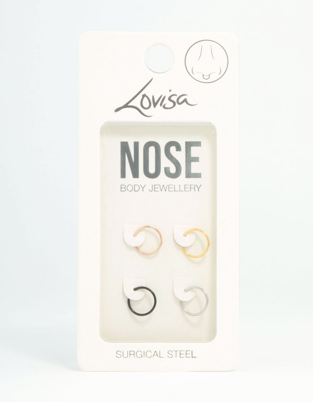 Upgrade your nose piercing game with this fun pack of 4 nose rings! Choose from gold, silver, rose gold, and black plated. So many choices, so much style.