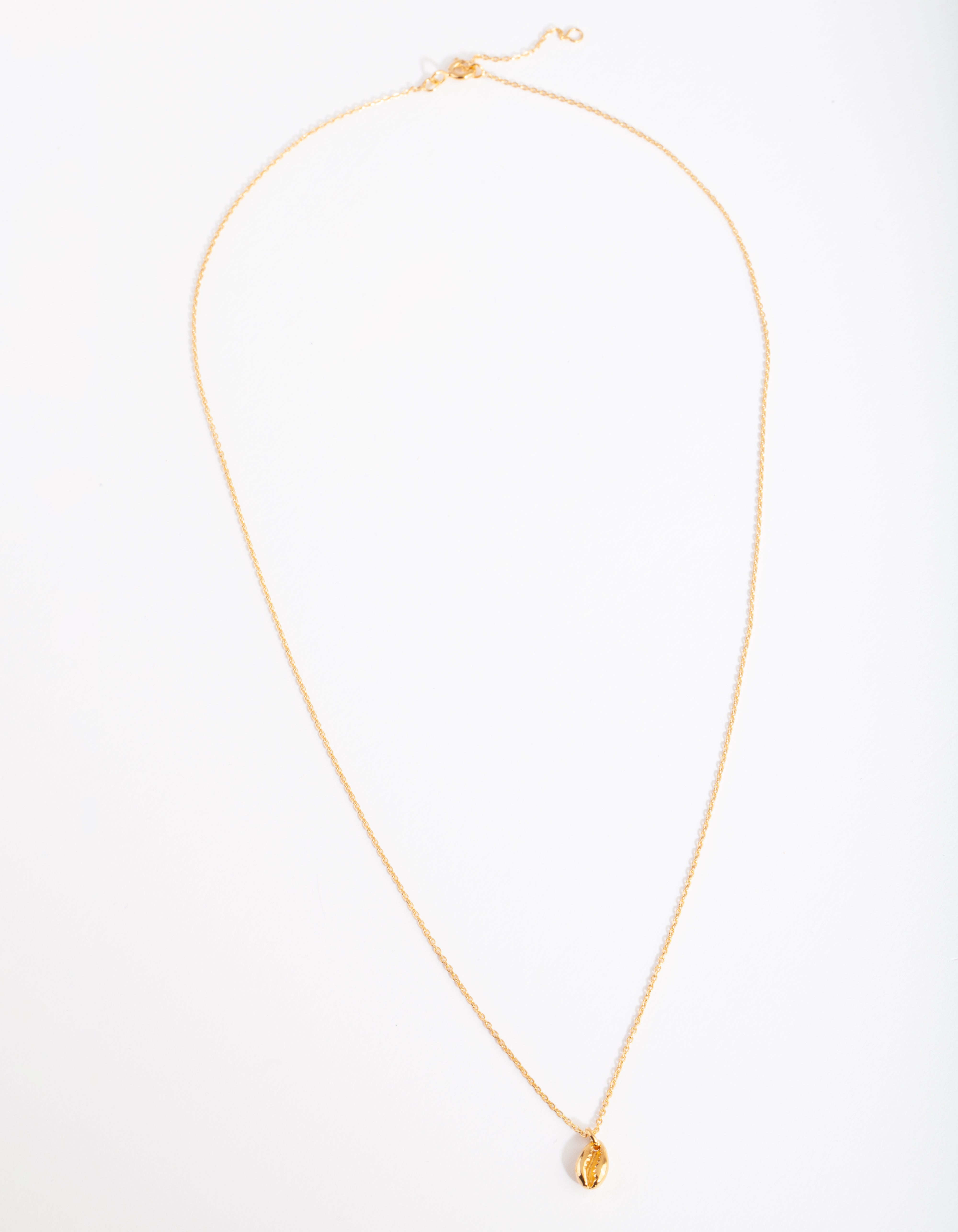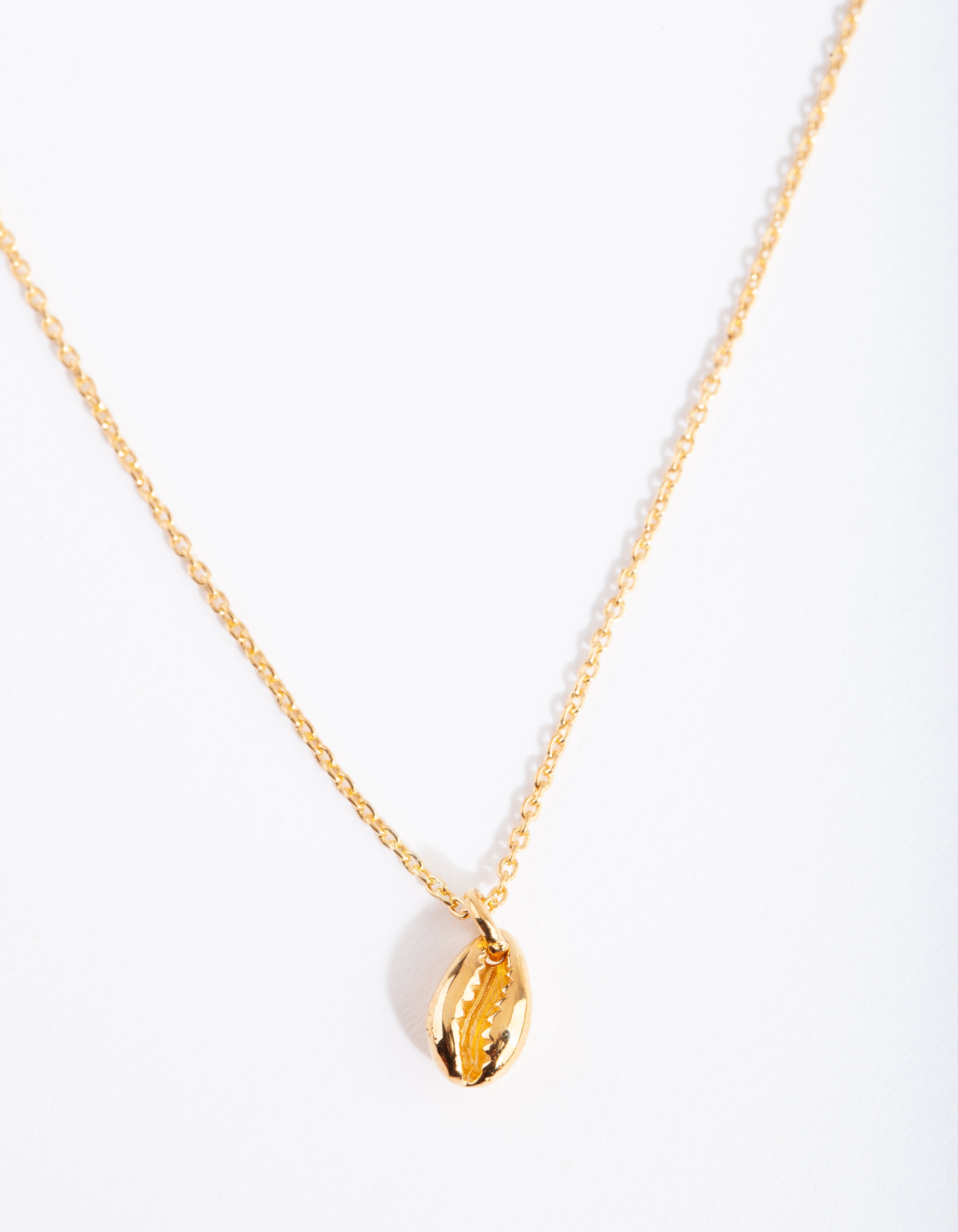 This gold plated sterling silver necklace boasts a cowrie shell pendant design on a thin chain.