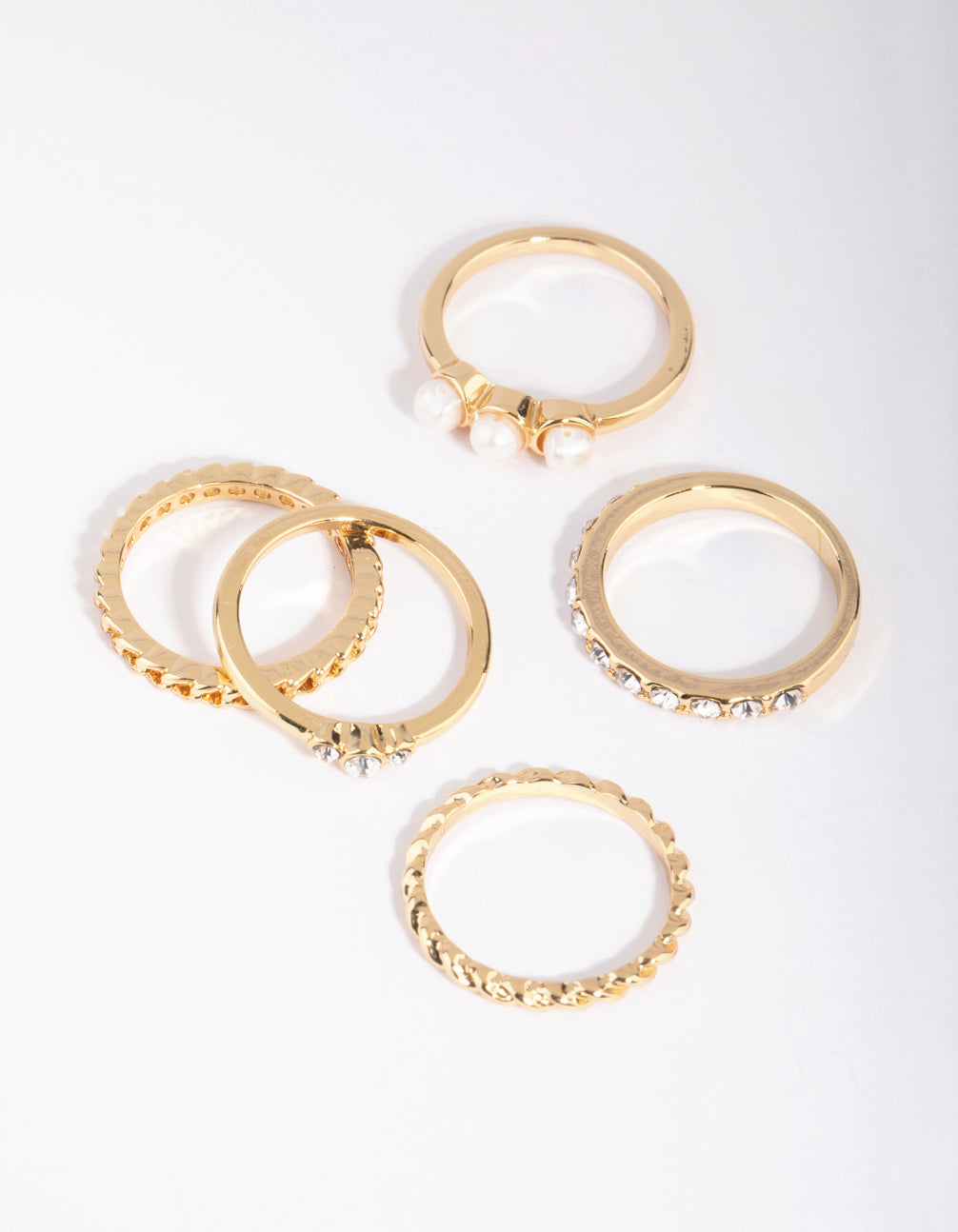 Gold Plated Diamante & Freshwater Pearl Ring 5-Pack