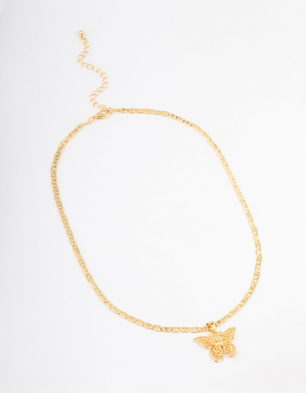 - This gold-plated necklace features a timeless, mariner chain and beautiful butterfly pendant for a 'fly look.