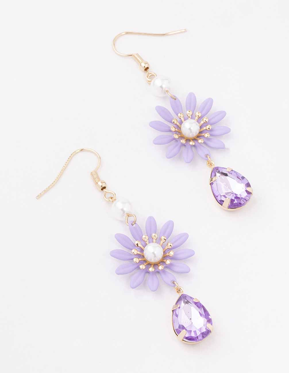 Gold Purple Coated Metal Pearl Flower Drop Earrings