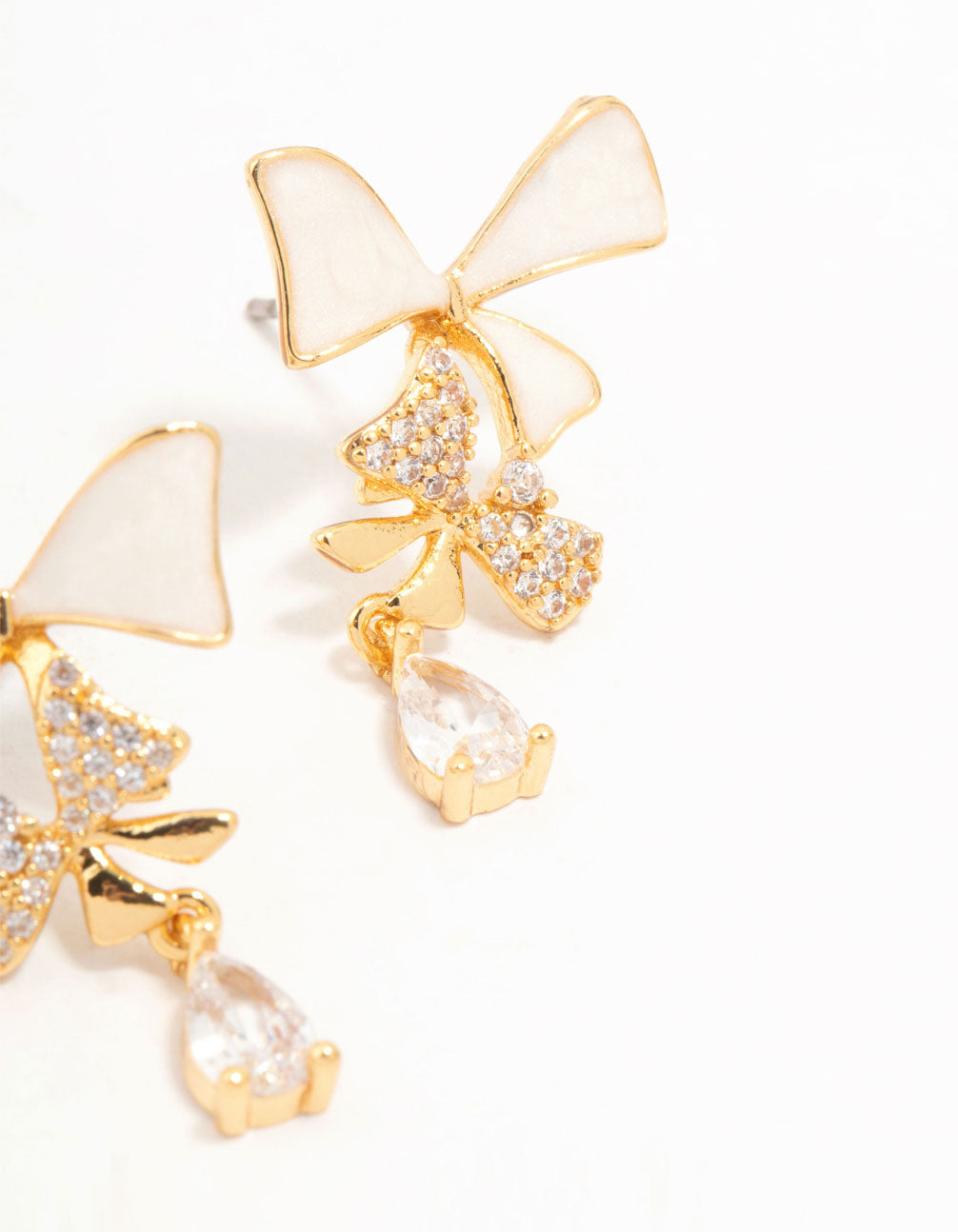 Real Gold Plated Cascading Cubic Zirconia & Cream Bow Drop Earrings