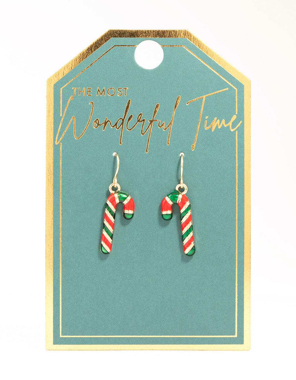 Bring sweetness to your holiday ensemble with these charming gold drop earrings. Crafted using enamel, they feature a festive red and green candy cane design, adding a playful flair to your look.