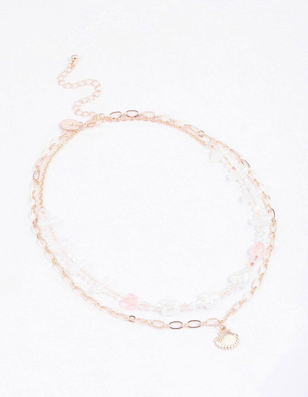 - This layered necklace features a collection of intricate shells and beading for a coastal-inspired look.