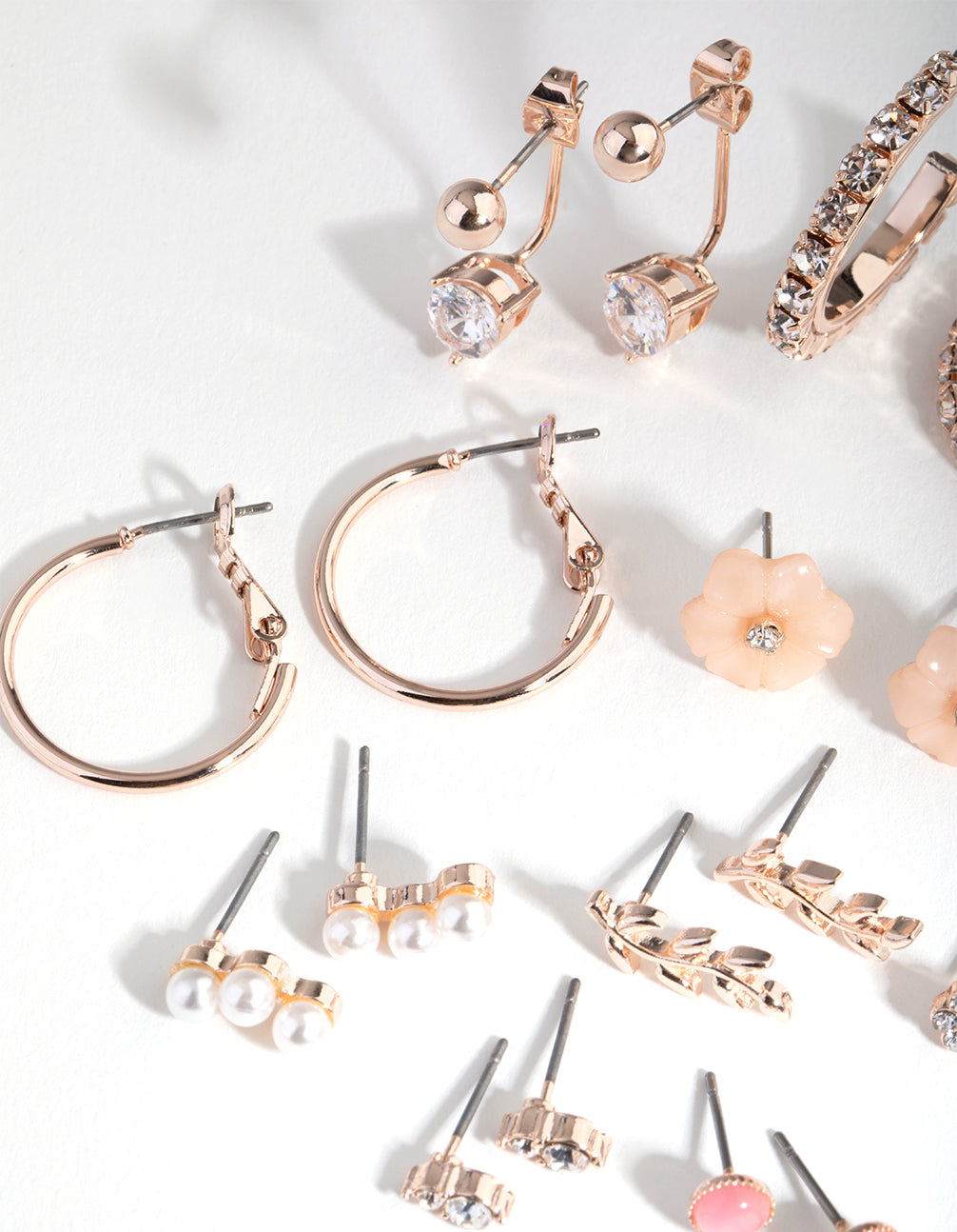 Mix them, match them, stack them! This lovely earring pack includes 16 pairs of rose-gold-toned earrings: 12 pairs of studs, three pairs of hoops and a pair of jacket earrings. Motifs include leafs, hearts and flowers and their are plenty of diamantes and faux pearls for extra shine. Change up your look daily, or stack them up together for maxium impact.