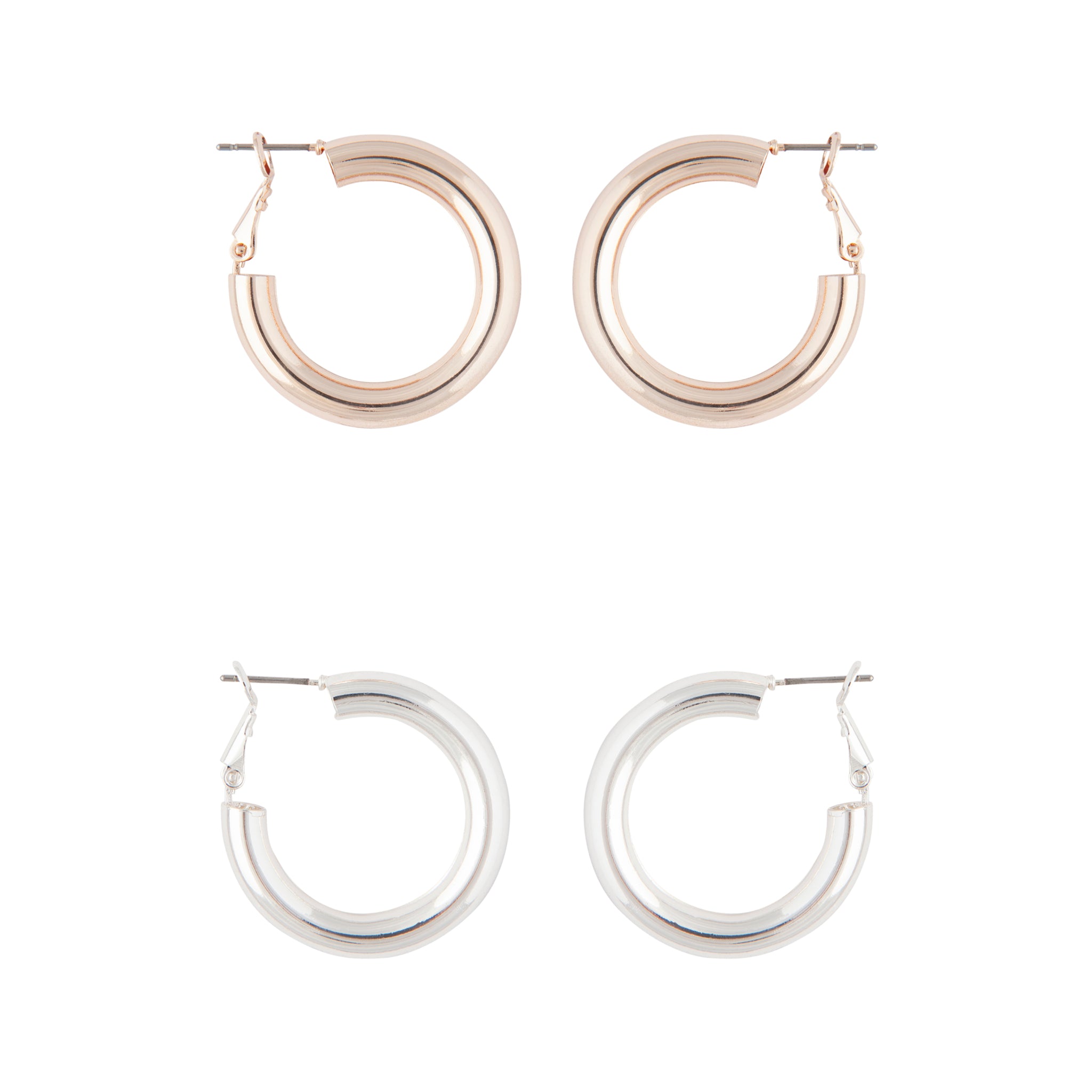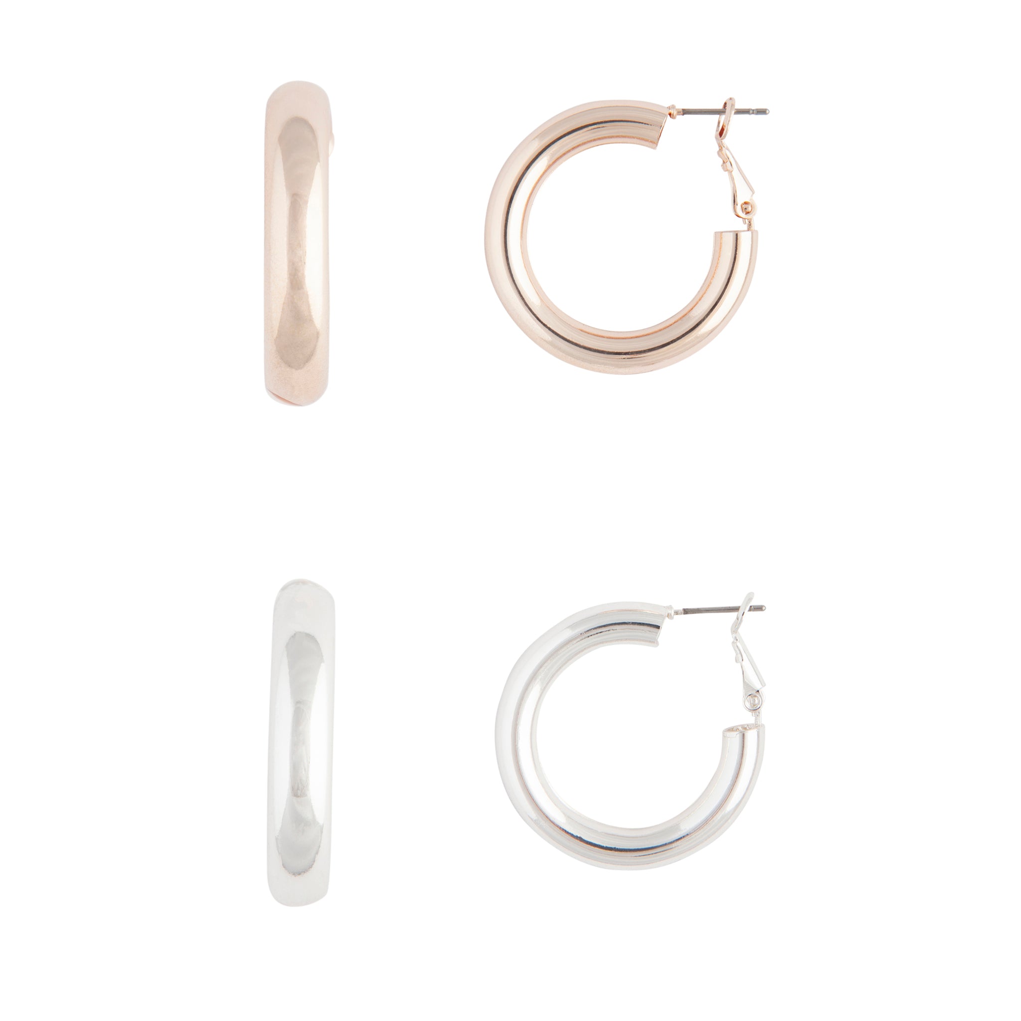 This 2 pack of chunky hoop earrings come with one polished gold-tone and one polished rose-gold-toned earring.