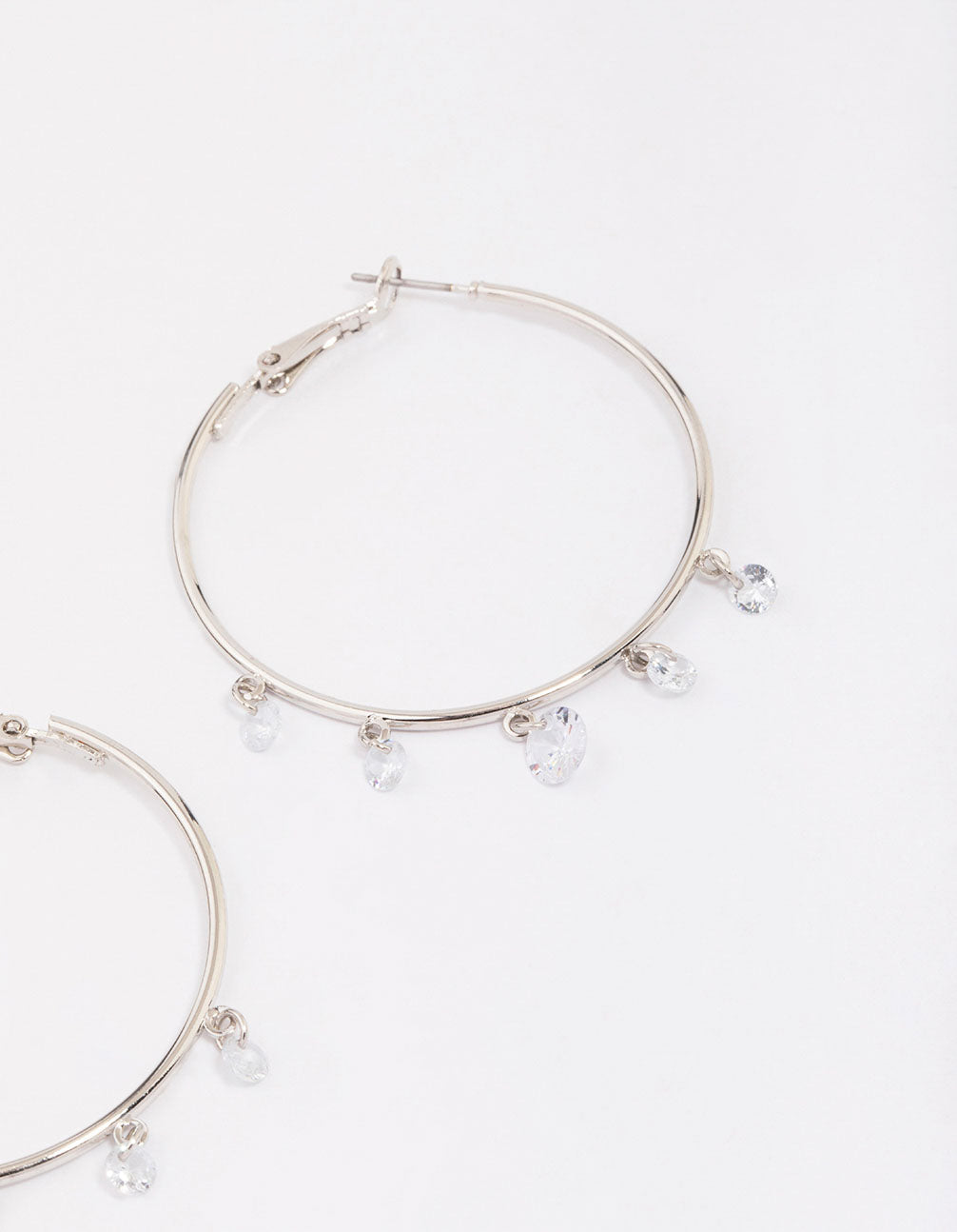Add detail to your look with these simple, silver-toned hoops. These hoop earrings feature a large, sleek profile adorned with dangling cubic zirconia crystals for an embellished touch.