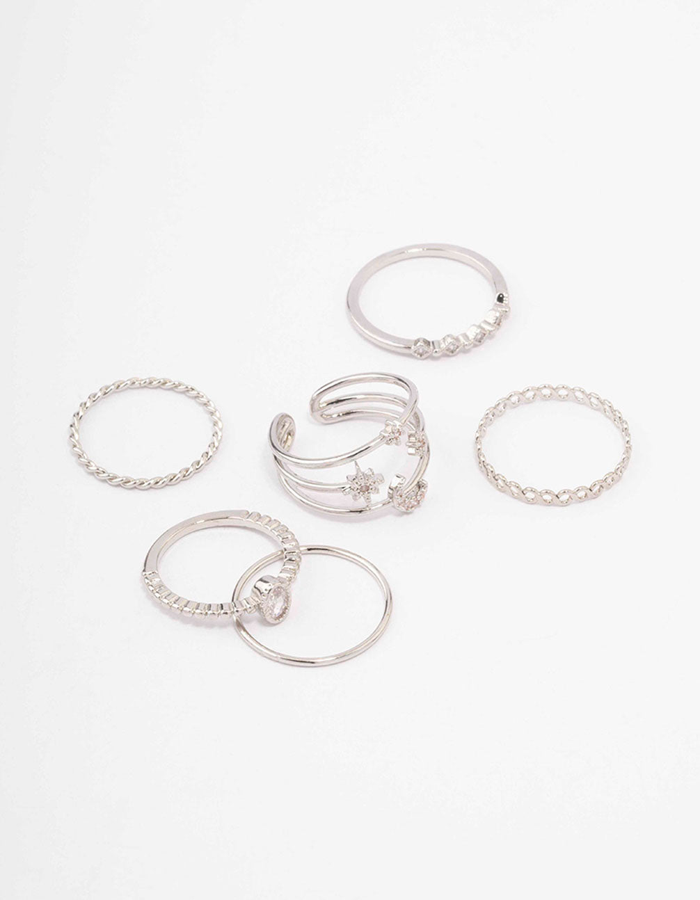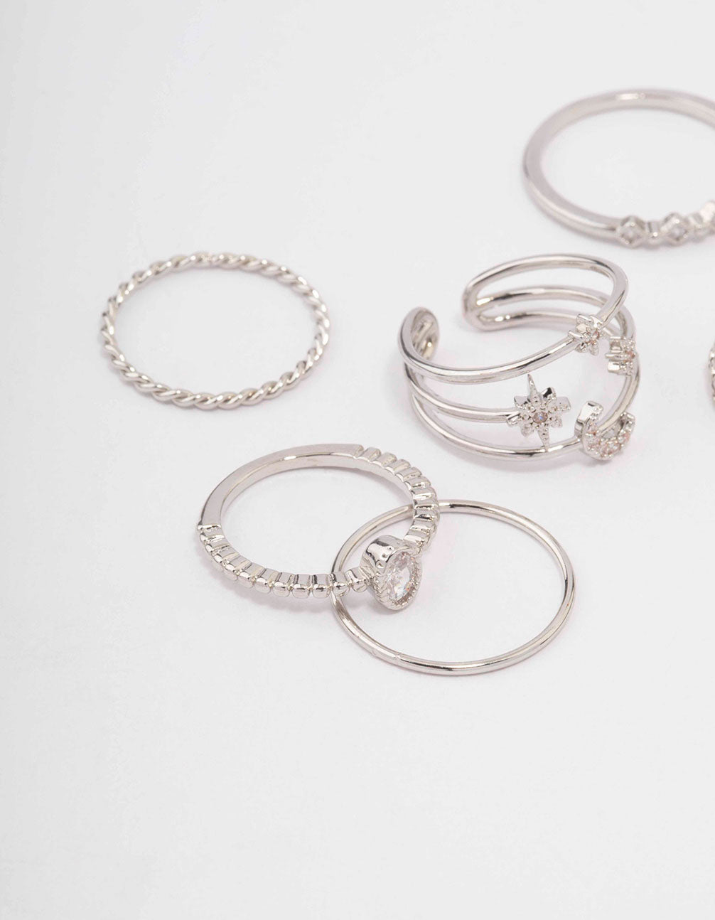 Embellish your stack with this set of cubic zirconia encrusted rings. This pack of silver stacking rings contains a mix of rings in varying shapes and silhouettes.