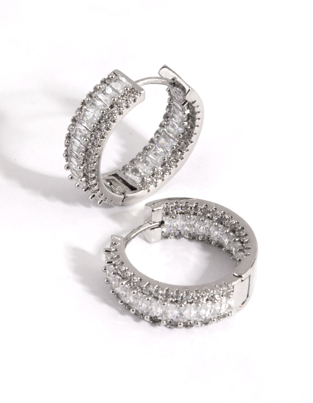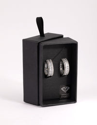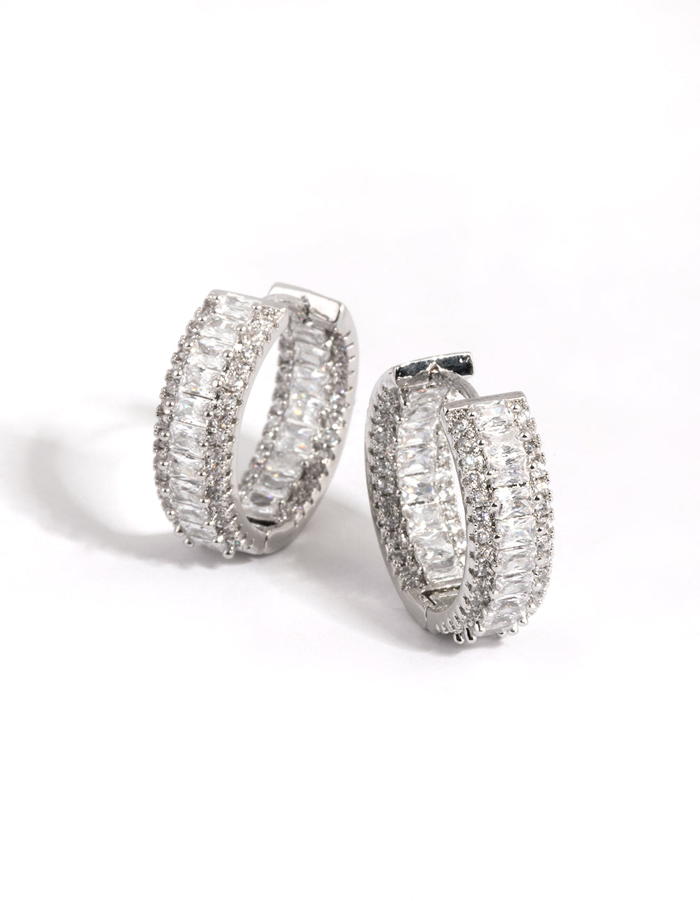 Dazzle with diamond simulants! These lab-created crystals are designed to closely replicate true diamonds. These beautiful silver-toned hoops feature diamond-simulant embellishments. Wear them for a formal finishing touch!