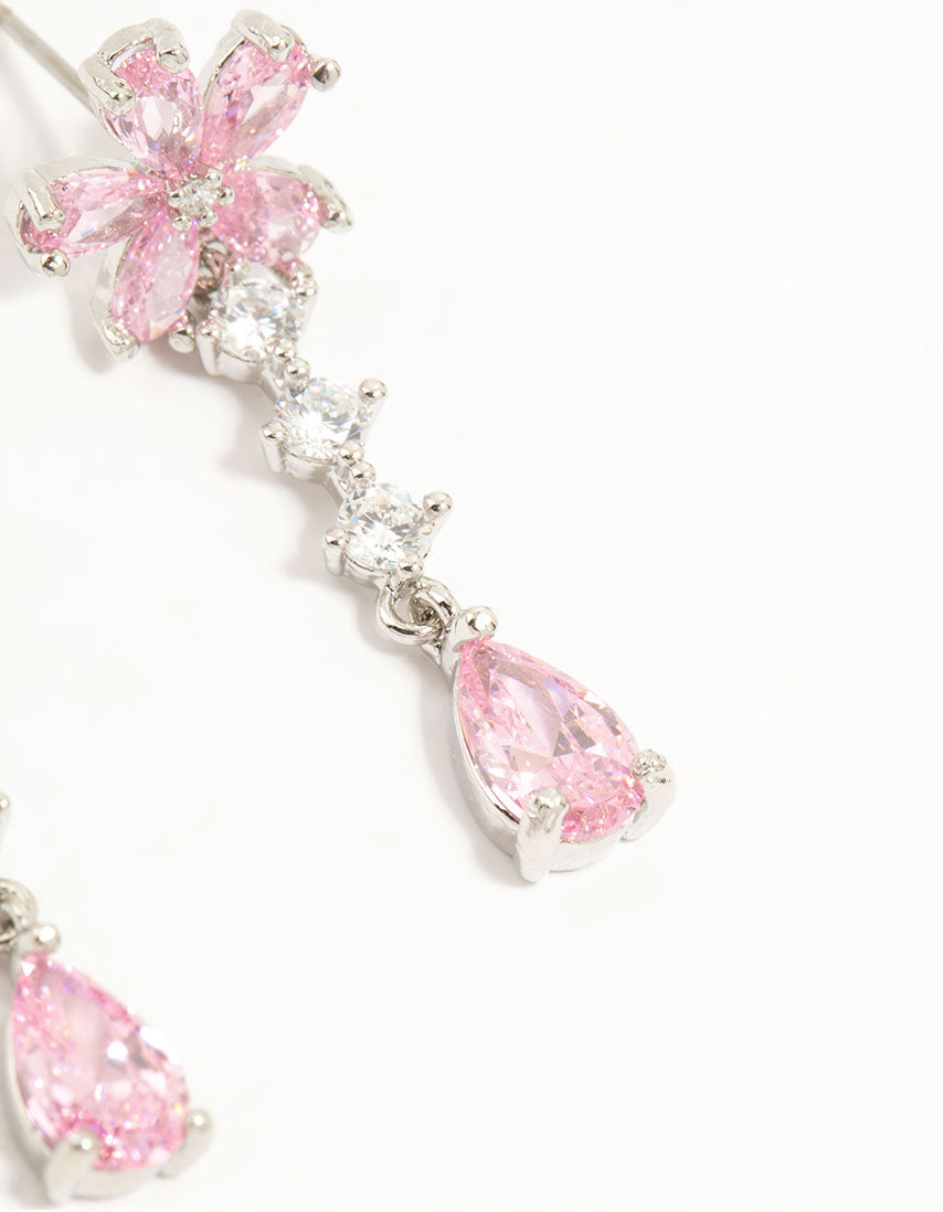 Silver Plated Pink Cubic Zirconia Flower Teardrop Stud Earrings