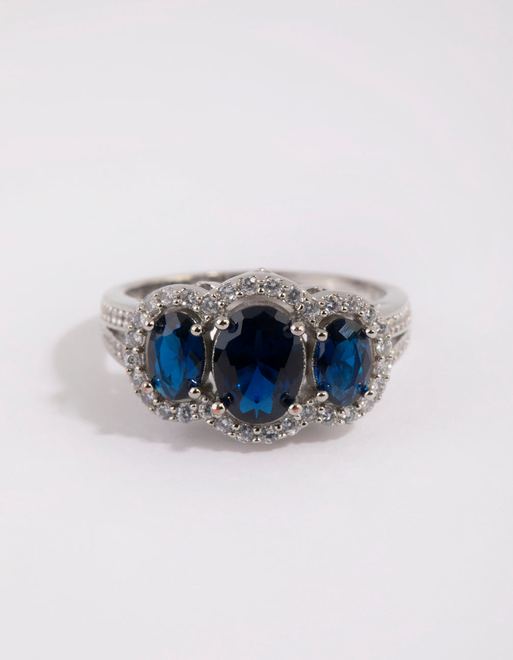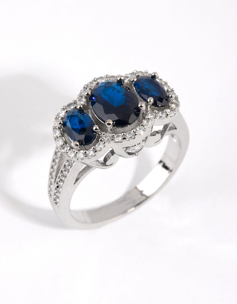 Silver Sapphire Cubic Zirconia Triple Stone Ring