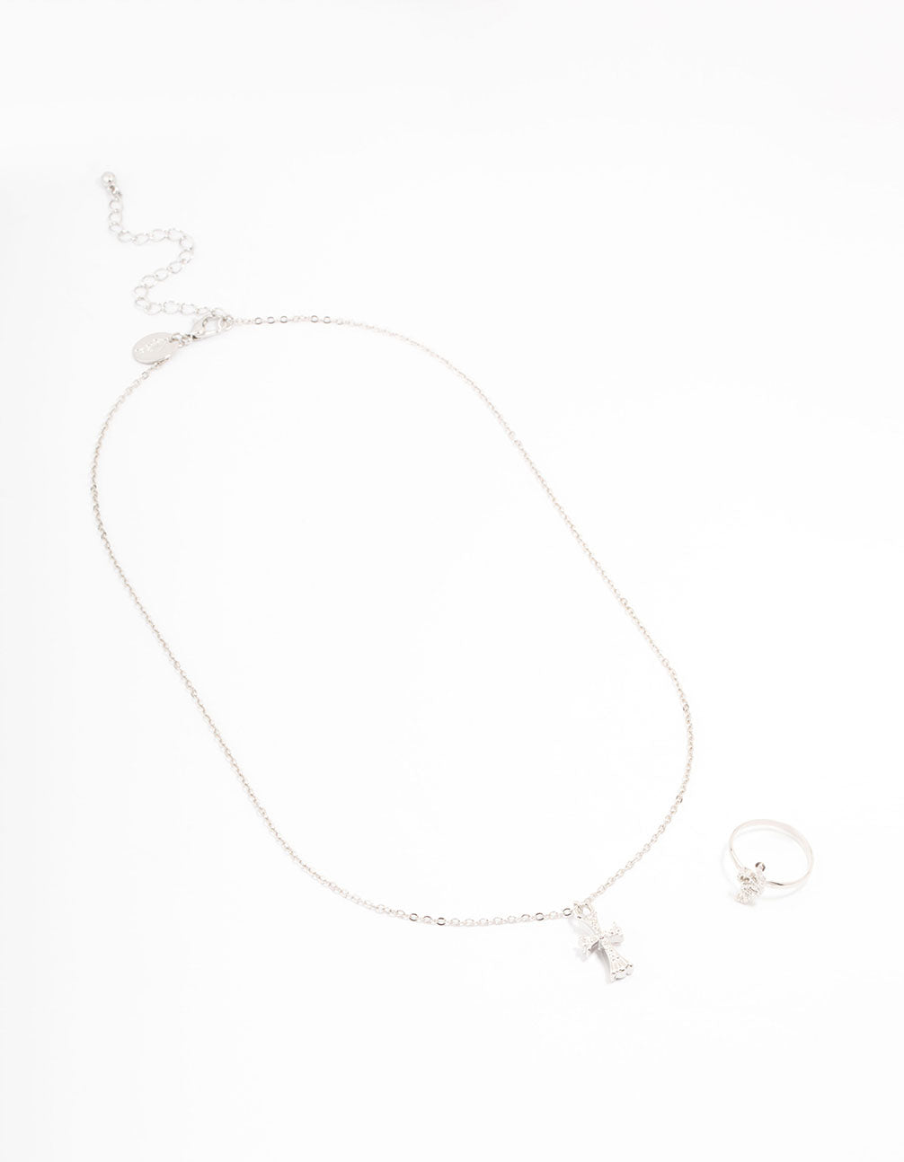 Complete your outfit with this simple jewellery set. This timeless set includes a classic pendant necklace and adorning ring, each designed with a snake silhouette.